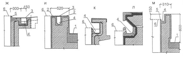 ж - переливной борт ванны; и - то же, ванны досугового назначения; к – борт ванны с переливным желобом; л - то же, из сборных элементов; м - то же, для терапевтических занятий; 1 - обходная дорожка; 2 - нескользкое мягкое покрытие; 3 - решетка; 4 - сливной желоб; 5 - бортовой валик; 6 - уровень воды