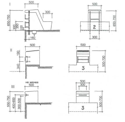 I – тумбочка с комбинированным поручнем для ванны с бортом, не выступающим над уровнем воды; II – то же, для ванны с бортом, выступающим над уровнем воды; III – тумбочка с горизонтальным поручнем для ванны с бортом, выступающим над уровнем воды