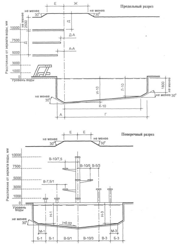 а – 25-метровая ванна для спортивного плавания с двусторонним продольным уклоном; б – то же, с односторонним продольным уклоном; в - то же, с двусторонним поперечным уклоном; г - 25-метровая универсальная ванна с вышкой для прыжков высотой 5 м; д - 50-метровая ванна для спортивного плавания с двусторонним продольным уклоном; е - то же, с односторонним продольным уклоном; ж - то же, с двусторонним поперечным уклоном; з - 50-метровая универсальная ванна с вышкой для прыжков высотой 10 м