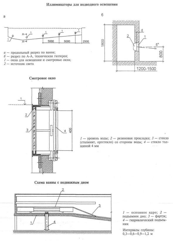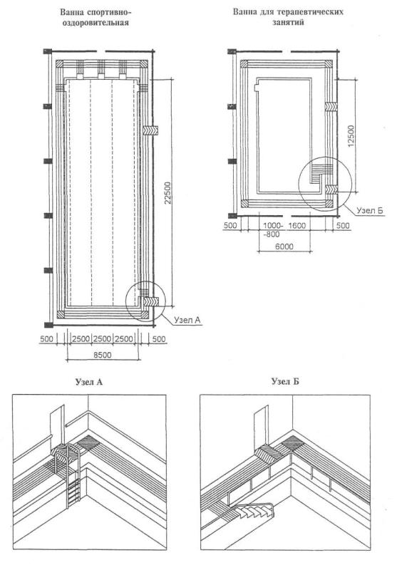 Схемы продольных профилей универсальных ванн и ванн для спортивного плавания