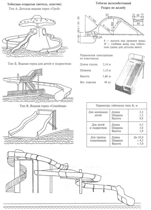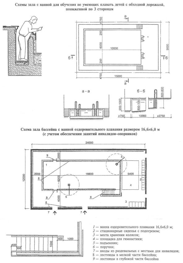 Размеры и глубину ванн для оздоровительных занятий и обучения не умеющих плавать до 7 лет следует принимать по нормам проектирования детских дошкольных учреждений. 4.2.6 Детские бассейны никогда не следует располагать рядом с глубокими бассейнами и подходы к ним не должны идти мимо глубоких бассейнов. Желательно располагать эти бассейны вблизи раздевалок, в нише, вблизи только мелких бассейнов и т.д., создавая наибольшую безопасность для маленьких детей. При детских бассейнах рекомендуется устраивать край бассейна на 40 см выше пола в форме сидения для сопровождающих лиц. 4.2.7 Размеры и форма ванн для обучения не умеющих плавать детей от 7 до 14 лет могут быть произвольными, при этом пропускную способность следует принимать из расчета 4 м2 зеркала воды на занимающегося. 4.2.8 В комплексных бассейнах с крытыми и открытыми ваннами рекомендуется дополнительно предусматривать открытые ванны сезонного действия для обучения не умеющих плавать. 4.2.9 При проектировании ванн для физкультурно-оздоровительных занятий в них следует предусматривать переливной желоб для сброса воды и уступ для отдыха. 4.2.10 В ваннах для обучения не умеющих плавать обходную дорожку по трем сторонам ванны рекомендуется опускать ниже верха стенки на 0,9 - 1 м; при этом допускается уменьшение ширины дорожки до 0,75 м. В некоторых случаях пониженная обходная дорожка предусматривается только по продольным сторонам ванны, а в торцах не делается. Пример плана зала с ванной для обучения не умеющих плавать размером 10´6 м приведен на рисунке 4.9. На рисунках 4.1, и, к, л показаны решения ванн школьных плавательных бассейнов. 4.2.11 Высота залов ванн (от поверхности воды до низа выступающих конструкций) для оздоровительного плавания, игр в воде и купания, как правило, принимается равной 5,4 - 4,8 м. Высота залов ванн для обучения плаванию принимается не менее 3,6 м от уровня воды. Ванны для обучения не умеющих плавать могут устраиваться напольными. 4.2.12 Кроме ванн для физкультурно-оздоровительных занятий, для детей и подростков целесообразно оборудовать водяные горки (тобоганы), показанные на рисунке 4.10. Горки для скатывания в воду (тобоганы) в плескательных ванных для детей дошкольного возраста устраивают из пластика, железобетона или металла. Высота площадки 2 - 3,8 м, длина горки в плане 4 - 14 м. Ширина лестницы и наклонной дорожки для спуска в воду 50 - 60 см. Уклон дорожки 25 - 35°, а радиус закругления нижней части не менее 3 м. Нижний конец желоба располагается на 10 - 50 см выше уровня воды, глубина которой в этом месте не должна превышать 40 - 100 см. Поверхность желоба тщательно отделывается пластиками, линолеумом, алюминием. Для лучшего скольжения на верхнюю площадку горки подводится вода, равномерно смачивающая желоб. Тобоганы для взрослых используются и как декоративные элементы в открытых бассейнах. 4.3 Ванны для занятий инвалидов4.3.1 Бассейны для спортивных занятий инвалидов должны проектироваться с соблюдением требований к конструктивным и планировочным решениям, а также к размещению оборудования, цветовому решению, акустике и освещению в соответствии с СНиП 35-01, СП 35-101 и СП 35-103. 4.3.2 Параметры и оборудование ванн бассейнов необходимо подбирать в зависимости от специфических особенностей нарушений здоровья у следующих основных групп инвалидов: 1) инвалиды с поражением органов двигательного