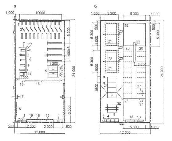а - зал при ванне для плавания и водного поло длиной 50 м; б - зал при специализированной ванне для прыжков в воду или универсальной ванне длиной 50 м; в - зал при ванне для плавания длиной 25 м; 1 - стенка гимнастическая; 2 - тренажер для специальной силовой подготовки пловцов; 3 - специализированный тренажер для пловцов; 4 - перекладина; 5 - помост тяжелоатлетический размером 2,8´2,8 м; 6 - стеллаж для грифов штанг и гантелей; 7 - стеллаж для дисков штанг; 8 - мат гимнастический; 9 - тренажер-тумба для развития прыгучести; 10 - тренажер для развития силы рук (инерционный); 11 - тренажер типа «Эспандер грузовой»; 12 - место тренера; 13 - зеркало; 14 -тренажер универсальный (многоснарядный) типа «Змеевчанин», «Геркулес» и т.п.; 15 - скамейка гимнастическая; 16 - щит для ватерполистов; 17 - щит для минибаскетбола; 18 - станок хореографический; 19 - сетка-ограждение; 20 - гимнастические маты; 21 - батут (складной, массовый); 22 - «сухой» трамплин; 23 - лонжа универсальная (подвесная); 24 - канат для лазания; 25 - ковер размером 5,3´5,3 м; 26 - козел гимнастический; 27 - мостик гимнастический эластичный; 28 - яма для батута; 29 - маты под «сухим» трамплином; 30 - брусья гимнастические