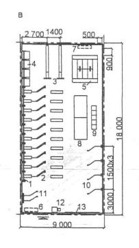 1 - двухъярусные закрытые шкафы; 2 - скамьи для переодевания; 3 - умывальник; 4 - сушилка для волос; 5 - преддушевая; 6 - вешалка для полотенец; 7 - душевая; 8 - стеллаж для мыла; 9 - ножной проходной душ (Поправка).