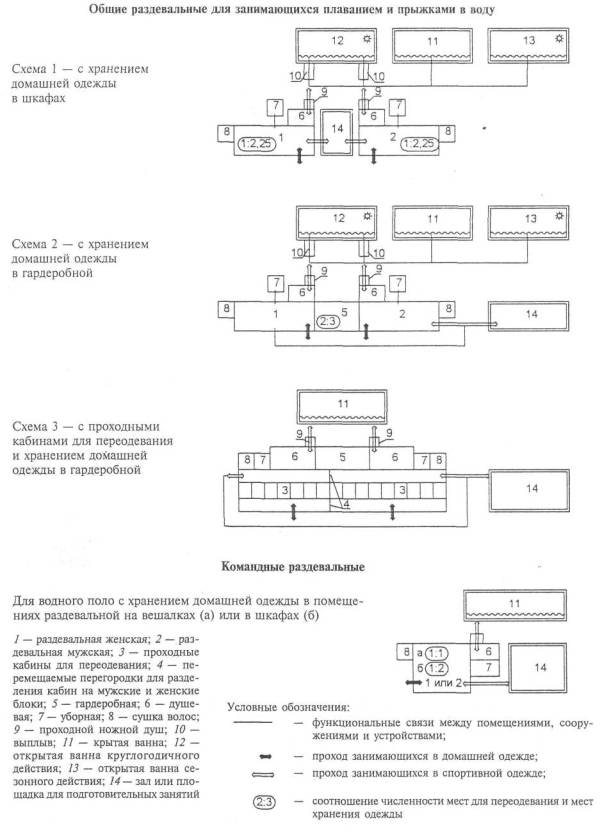 1 - вестибюль; 2 - гардеробная верхней одежды; 3 - касса; 4 - регистратура; 5 - фойе; 6 - буфет (кафе); 7 - места для зрителей; 8 - ванна для плавания и водного поло; 9 - ванна для прыжков; 10 - учебная ванна; 11 - детская ванна; 12 - ванна оздоровительного плавания для взрослых и детей старшего возраста; 13 - ванна для детей среднего возраста; 14 - ванна для детей младшего возраста; 14а - плескательная ванна; 15 - зона отдыха; 16 - игровые площадки; 17 - раздевальные; 18 - командные раздевальные для ватерполистов; 19 - душевые; 20 - туалеты; 21 - зал подготовительных занятий; 22 - гардеробные домашней одежды; 23 - площадка подготовительных занятий; 24 - пункт медицинского контроля (врач); 25 - тренерская; 26 - учебная часть; 27 - учебный класс; 28 - методический кабинет; 29 - сауна; 30 - массажная; 31 - дежурный инструктор; 32 - дежурная медсестра; 33 - холл для отдыха занимающихся; 34 - административно-служебные помещения; 35 - пресс-центр; 36 - комментаторские; 37 - радиоузел; 38 - бытовые помещения для рабочих; 39 - лаборатория анализа качества воды; 40 - инвентарные; 41 - вентиляционная камера; 42 - электрощитовая; 43 - насосно-фильтровальная; 44 - помещения бактерицидной обработки воды; 45 - бойлерная; 46 - мастерская