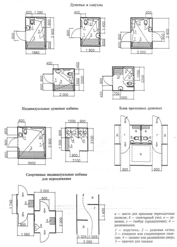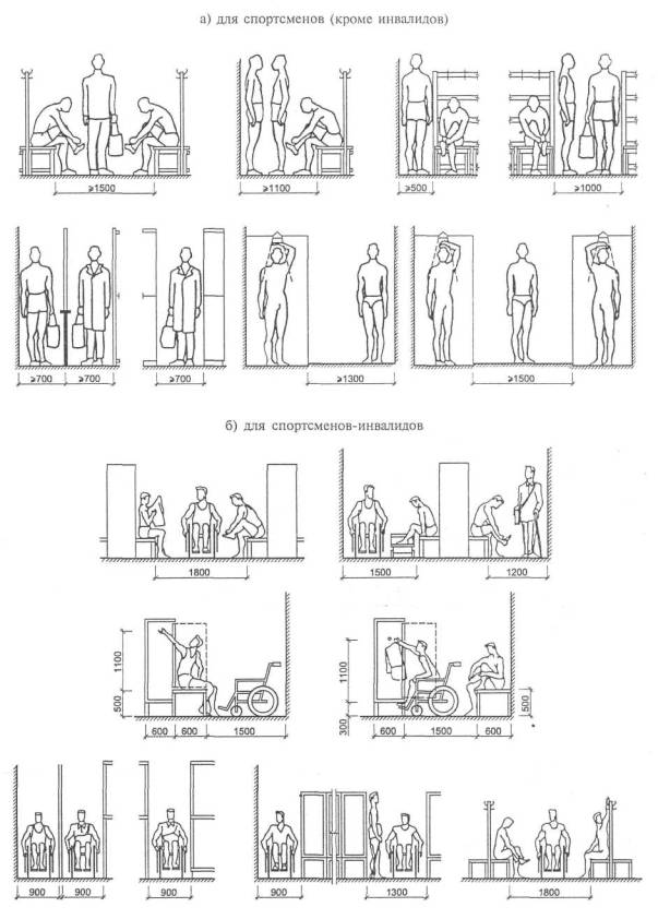 5.13 Схематические планы раздевальных с душевыми и санитарными узлами приведены на рисунке 5.5. Пропускная способность ванны 25´11 м (при оздоровительном плавании) - 48 человек в смену. В каждой из двух (женской и мужской) раздевален размещены 24 места для переодевания, 36 двухъярусных закрытых шкафов для хранения одежды, мойка для ног, сушки для волос, душевая на 8 сеток; санузел с умывальником в шлюзе. Пунктиром показана возможность установки дополнительных мест (скамеек) для переодевания. Пропускная способность ванны бассейна 50´21 м (при оздоровительном плавании) - 120 человек в смену. В каждой из двух (женской и мужской) раздевальных размещены 60 мест для переодевания, 90 двухъярусных закрытых шкафов для хранения одежды, сушки для волос, душевая на 20 сеток; санузел с умывальником в шлюзе. (Поправка). 5.14 Кабины душевых и раздевальных для инвалидов приведены на рисунке 5.6. 5.15 Вспомогательные помещения аквапарка (душевые, раздевальные, санитарные узлы) оборудуются в соответствии с требованиями по оборудованию помещений для плавательных бассейнов. 6 Вспомогательные помещения6.1 Состав вспомогательных помещений бассейна формируется из обязательных (по основной функции) и рекомендуемых дополнительных помещений (приложение А). 6.2 Высота вспомогательных помещений принимается, как правило, равной 3 м. В зависимости от архитектурно-планировочного решения и технологических требований, а также при размещении вспомогательных помещений в подтрибунном пространстве высота помещений может быть уменьшена до: 2,1 м - в выделенной гардеробной верхней одежды; 2,7 м - в остальных помещениях, кроме вестибюлей. 6.3 Площадь вестибюля (без тамбура) определяется из расчета 0,5 м2 на одного занимающегося в смену (но не менее 20 м2) и 0,25 м2 на одно зрительское место. В демонстрационных бассейнах рекомендуется устройство раздельных вестибюлей для занимающихся (соревнующихся) и зрителей. Пути движения занимающихся из вестибюля в раздевальни рекомендуется обособлять от путей движения зрителей. В вестибюлях спортивных и оздоровительных бассейнов, работающих в зимнее время при расчетной температуре наружного воздуха ниже минус 15 °С, должно предусматриваться устройство тамбуров или воздушно-тепловых завес. 6.4 Площадь гардеробной верхней одежды для занимающихся и зрителей определяется из расчета 0,1 м2 на одно место, но не менее 10 м2 (в оздоровительных бассейнах - не менее 6 м2). Расчетное число мест в гардеробной верхней одежды для занимающихся принимается на 300 % пропускной способности смены. В бассейнах без залов или площадок подготовительных занятий площадь принимается 200 % численности смены. Гардеробная для верхней одежды зрителей рассчитывается на 100 % зрительских мест. Глубина гардеробной не должна превышать 6 м. В крытых бассейнах в расчетное число мест следует включать сотрудников, число которых определяется типовыми штатными расписаниями. 6.5 Помещение для родителей, ожидающих детей, площадью 16 -20 м2 желательно размещать смежно с залом ванны для обучения, отделенное от зала остекленной перегородкой с автоматически или вручную управляемой шторкой со стороны зала ванны. Допускается располагать ожидающих родителей в вестибюле на дополнительной площади 0,5 м2 на одно место на 100 % единовременной пропускной способности детской ванны (ванн). Места для верхней одежды роди