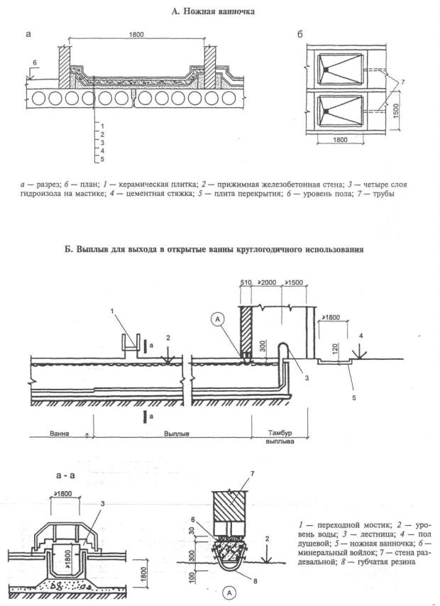 5.8 Выплывы при выходе из душевых в открытые ванны круглогодичного использования устраиваются в боковой части продольной стены с мелкой стороны ванны (рисунок 5.4, Б). Из мужских и женских раздевальных делаются раздевальные выплывы. Ширина выплыва 1,8 - 2,2 м при глубине воды 0,9 -1,0 м для взрослых и 0,6 -0,7 м - для детей. Над выплывом предусматривается затвор, предохраняющий помещения от холодного воздуха. Нижняя кромка затвора должна быть обрамлена эластичными материалами, препятствующими поступлению холодного воздуха, и опускаться в воду на 10 - 15 см. Выплывы должны быть оборудованы в виде тамбура и защищены от возможного поступления воды из душевых. На всю ширину обходной дорожки над выплывом устанавливается деревянный или металлический переходной мостик с подъемом в центральной части на 0,6 - 0,8 м над водой. Летом мостик заменяется плоскими съемными щитами. 5.9 В раздевальных следует предусматривать мойки для ног из расчета одна мойка на 20 мест для переодевания, но не менее одной. 5.10 В раздевальных или смежных с ними помещениях устанавливаются сушки для волос из расчета: один прибор на 10 мест для переодевания в женских раздевальных и один прибор на 20 мест - в мужских в смену. 5.11 Санитарные узлы для занимающихся должны размещаться при раздевальных и исключать возможность попадания из них к ваннам, минуя душевые. Не допускается располагать санитарные узлы и душевые над помещениями для приготовления и хранения коагулирующих и дезинфицирующих растворов. 5.12 Расчетное число санитарных приборов во вспомогательных помещениях приведено в таблице 5.2. Размеры кабин, проходов, а также расстояния между приборами приведены в таблице 5.3.