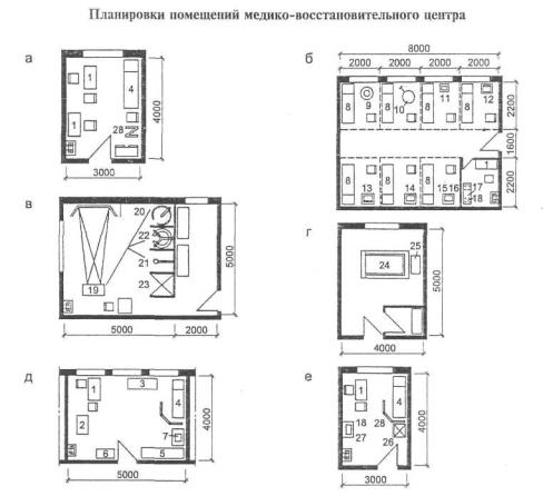 а - кабинет врача (заведующего центром); б - кабинет электро- и светолечения; в - душевой зал; г - подводный душ-массаж; д -кабинет для проведения тестов с физической нагрузкой; е - процедурная; 1 - стол врача; 2 - электрокардиограф; 3 - спирограф; 4 - смотровая кушетка; 5 - велоэргометр; 6 - шкаф медицинский; 7 - фонограф; 8 - кушетка для электро- и светолечения; 9 - облучатель ультрафиолетовый; 10 - светотепловой облучатель; 11 - аппарат для УВЧ-терапии; 12 - аппарат для ультразвуковой терапии; 13 - аппарат для электростимуляции мышц; 14 - облучатель ультрафиолетовый коротковолновый; 15 - аппарат для лечения диадинамическим током; 16 - аппарат для магнитотерапии; 17 - шкаф сушильно-вытяжной; 18 - кипятильник-стерилизатор; 19 - пульт управления водолечебной кафедрой; 20 - душ циркулярный; 21 - душ дождевой; 22 - душ восходящий; 23 - душ гигиенический; 24 - ванна подводного душа-массажа; 25 - аппарат для подводного душа-массажа; 26 - холодильный шкаф; 27 - столик инструментальный; 28 - ширма переносная