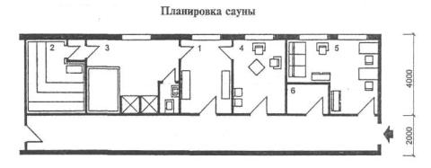 1 - раздевальня; 2 - камера бани сухого жара; 3 - душевая с ванной; 4 - комната отдыха; 5 - комната персонала; 6 - кладовая