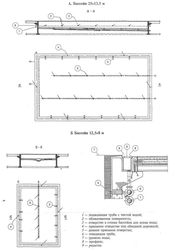 10.16 Плавательные бассейны должны оборудоваться системами, обеспечивающими водообмен в ваннах бассейна. Пример организации водообмена приведен на рисунке 10.1. По характеру водообмена допускаются к эксплуатации следующие типы бассейнов: · рециркуляционного (оборотного) типа; · проточного типа; · с периодической сменой воды. 10.17 Водоподготовка для бассейнов должна соответствовать условиям водообмена. Выбор метода водообмена определяется технико-экономическим расчетом. Система водоподготовки должна обеспечивать автоматическое дозирование реагентов. Систему водообмена непрерывным потоком рекомендуется применять, как правило, в ваннах с объемом воды не более 70 м3. 10.18 Водообмен в ваннах бассейнов следует предусматривать с рециркуляцией воды (многократное использование с очисткой, дезинфекцией и одновременным пополнением убыли свежей водопроводной водой в пределах до 10 % объема воды в ванне) или с непрерывным протоком свежей воды (разовое использование с дезинфекцией). При этом продолжительность полной смены воды (водообмена) в ваннах должна приниматься в часах, не более для бассейнов: спортивных - 8,0; оздоровительных - 6,0; детских учебных: до 7 лет - 0,5; 7 лет и старше - 2,0. Указанное время полного водообмена не относится к бассейнам проточного типа с пресной водой. При недостаточных дебитах источника воды и соответствующем технико-экономическом обосновании допускается увеличение времени наполнения ванн, оборудованных системами рециркуляции, до 48 ч. Система рециркуляции при этом должна работать постоянно. 10.19 Подача воды в ванны бассейнов может осуществляться через отверстия в стенках и дне ванн, расположение которых должно обеспечивать равномерное распределение ее по всему объему для поддержания постоянства ее температуры, а также равномерное распределение дезинфектанта. Для подачи воды в ванны бассейнов допускается использование перфорированных труб, укладываемых в теле уступа для отдыха под облицовкой (без изменения отметки верха уступа). Скорость выхода воды из подающих отверстий следует принимать 2 - 3 м/с. 10.20 Для бассейнов проточного типа и со сменой воды допускается использование исходной воды, поступающей из централизованной системы питьевого водоснабжения, без дополнительного обеззараживания при условии, что качество исходной воды по микробиологическим показателям соответствует требованиям приложения 2 СанПиН 2.1.2.1331. 10.21 Очистку технологической воды ванн бассейнов следует предусматривать фильтрами с предварительной коагуляцией в соответствии с требованиями СНиП 2.04.01 и СанПиН 2.1.2.1188. Для очистки и обеззараживания воды должны использоваться только технологии, на которые имеются санитарно-эпидемиологические заключения. Перед очистными сооружениями следует устанавливать сетчатые фильтры (волосоуловители). Водосточные сооружения в бассейнах следует предусматривать раздельно для каждой ванны или для группы ванн одинакового назначения и возраста занимающихся в них. 10.22 Сооружения для очистки, обеззараживания и распределения воды могут располагаться в основном или отдельно стоящем здании. Последовательное включение в единую систему водоподготовки двух ванн или более не допускается. Озонаторная установка должна иметь дегазатор для нейтрализации непрореагировавшего озона, выбрасываемого в атмосф