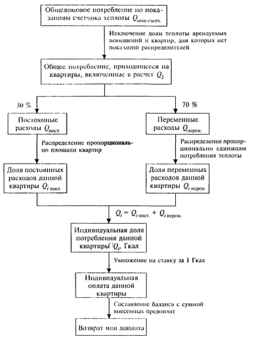 где DR - оцениваемая величина разности показаний распределителя для данного отопительного прибора; DRj - разности показаний исправных распределителей на других отопительных приборах вдоль стояка отопления по всем остальным этажам; п - число остальных отопительных приборов вдоль стояка отопления. Способ оценки показаний распределителей в таких случаях определяется по согласованию с управляющей организацией. Для определения единиц потребления по данному помещению величину разности показаний распределителей, полученную путем оценки, необходимо умножить на радиаторный коэффициент данного отопительного прибора и на коэффициент расположения помещения. 9.12. Доля отапливаемых помещений в здании, потребление в которых рассчитывается путем оценки (в том числе квартиры, исключенные из расчета), должна составлять не более 75 % (см. пп. 5.4, 9.4). 9.13. После того как рассчитаны единицы потребления по всем квартирам, участвующим в расчете, производится распределение переменных расходов в соответствии с п. 9.5. 9.14 Таким образом (см. пп. 9.4, 9.5) получается для каждой квартиры ее доля в постоянных расходах Qi пост. и в переменных расходах Qi переем. Общая доля индивидуального потребления данной квартиры, выраженная в Гкал, получается при сложении доли в постоянных расходах и доли в переменных расходах: Qi = Qi пост. + Qi перем.. 9.15. Обобщенная схема расчета обшей доли индивидуального потребления каждой квартиры (схема распределения) приведена на рис. 1. Рис 1. Обобщенная схема распределения общедомовых затрат тепловой энергии 10. ОРГАНИЗАЦИЯ ОПЛАТЫ ЗА ОТОПЛЕНИЕ В ДОМАХ, ОБОРУДОВАННЫХ КВАРТИРНЫМИ ПРИБОРАМИ УЧЕТА10.1. В жилых домах, оборудованных системами поквартирного учета на базе квартирных счетчиков теплоты, оплата за отопление производится жильцами в течение расчетного периода ежемесячно по показаниям квартирных счетчиков, умноженных на тариф, зафиксированный на данный расчетный период управляющей организацией. 10.2. В жилых домах, оборудованных системами поквартирного учета на базе распределителей теплоты, оплата за отопление производится жильцами в течение расчетного периода ежемесячно по ставкам, зафиксированным для каждой квартиры на данный расчетный период. Ставку ежемесячных оплат на данный расчетный период устанавливает управляющая организация. Сумма оплат всех квартир за каждый месяц должна быть достаточной, чтобы управляющая организация могла расплатиться с поставщиком теплоты по показаниям общедомового счетчика. 10.3. Фиксированные ежемесячные оплаты на данный расчетный период могут быть начислены для жильцов различными способами: а) на основании действующих нормативов за отопление на 1 кв. м площади квартиры; б) на основании потребления данной квартиры за предыдущие расчетные периоды и др. 10.4. Перерасчет оплат по показаниям квартирных приборов учета производится для каждой квартиры в конце расчетного периода на основании рассчитанной индивидуальной доли потребления каждой квартиры (раздел 9 «Определение индивидуальной доли каждого потребителя»). Чтобы получить расчетную оплату каждой квартиры Si в соответствии с индивидуальным потреблением, необходимо индивидуальную долю каждой квартиры Qi, выраженную в Гкал, умножить на стоимость 1 Гкал: Si = Qi × SГкал. Затем для каждой квартиры составляется баланс между ее расчетной оплатой 