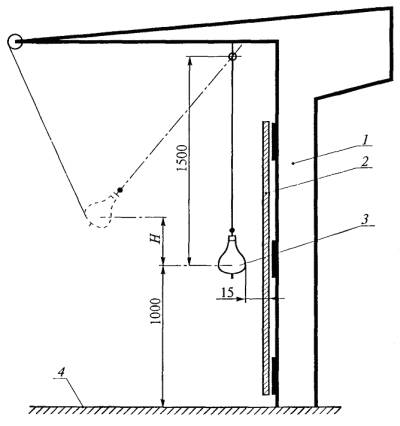 3.4. Маятник должен быть поднят на необходимую высоту и отпущен. Он должен ударить панель посредине ее ширины и на высоте 1,0 ± 0,05 м от уровня пола, назначенного для данной панели.