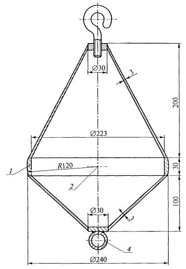 Маятниковое приспособление для жесткого удара должно представлять собой тело, аналогичное показанному на рис. 2. Такое тело состоит из ударного кольца и корпуса, выполненного из стали. Это тело заполняют свинцовыми шариками диаметром 3,5 ± 0,25 мм и таким образом доводят его массу до величины 10 ± 0,01 кг.