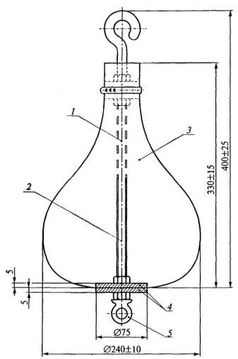 1 - стержень с нарезанной резьбой; 2 - базисная точка для измерения высоты падения в плоскости максимального диаметра; 3 - кожаный мешок; 4 - стальной диск; 5 - крепление пускающего приспособления