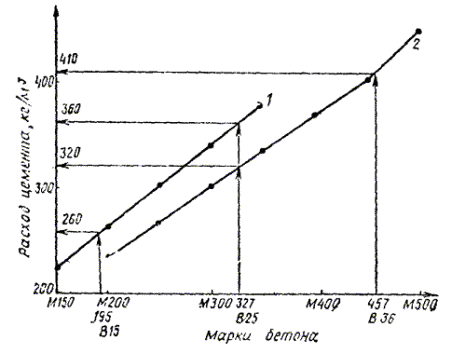 (Измененная редакция). ПРИЛОЖЕНИЕОбязательное ПРИМЕР ОПРЕДЕЛЕНИЯ ТАБЛИЧНОЙ НОРМЫ РАСХОДА ЦЕМЕНТА ДЛЯ КЛАССОВ БЕТОНА В 15, В 25 И В 35 С ОТПУСКНОЙ ПРОЧНОСТЬЮ, РАВНОЙ 70 % ПРОЕКТНОЙ, И УДОБОУКЛАДЫВАЕМОСТЬЮ БЕТОННОЙ СМЕСИ 1-4 см1. Для нахождения табличной нормы расхода цемента требуемого класса необходимо построить график зависимости «Расход цемента - марка бетона» для соответствующих требований к бетону.