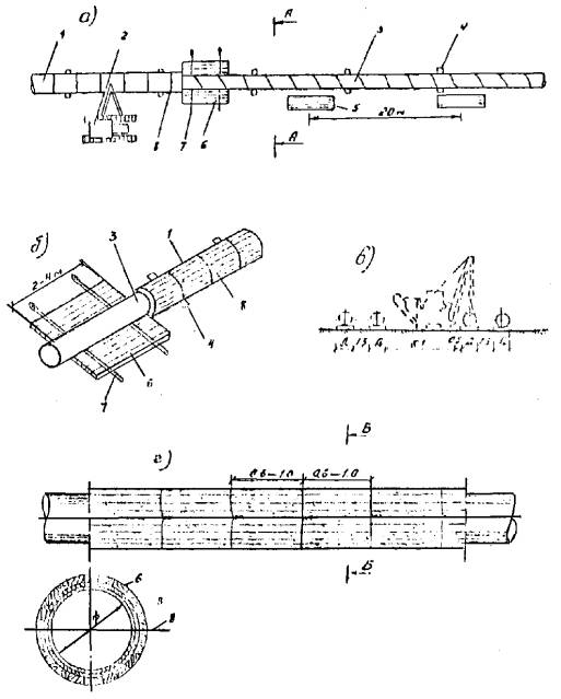 Рисунок. Схема футеровки трубопровода деревянными рейками а - производство работ по футеровке одной плети; б - футеровка трубопровода рейками с помощью двух поясов; в - футеровка нескольких плетей; г - футерованный участок трубопровода 1 - футерованный участок трубопровода; 2 - трубоукладчик Т 15-30; 3 - заизолированный участок трубопровода; 4 - лежки; 5 - пакет футеровочной рейки; 6 - футеровочная рейка; 7 - переносные пояса; 8 - проволочная скрутка. 2.5. Состав комплексной бригады и график выполнения работ приведены в табл. 1. 2.6. Калькуляция трудовых затрат приведена в табл. 2. 2.7. Методы и приемы труда рабочих при выполнении работ по футеровке трубопровода в технологической карте не представлены и разрабатываются отдельными картами трудовых процессов. Таблица 2 Калькуляция трудовых затрат (на 100 м трубопровода)