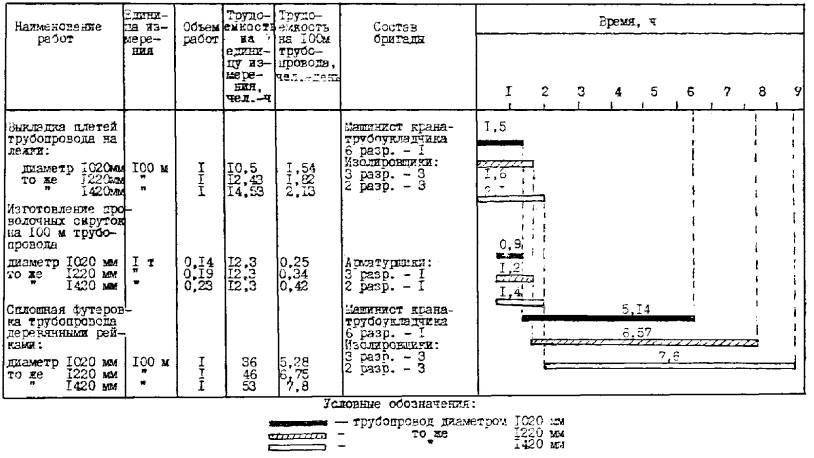КАРТА Москва 1983 Технологическая карта устанавливает технологию и организацию работ по футеровке деревянными рейками трубопроводов диаметрами 1020 - 1420 мм при строительстве подводных переходов. В технологической карте рассмотрены вопросы организации и технологии строительного процесса; приведены технико-экономические показатели, график выполнения работ, калькуляция трудовых затрат, материально-технические ресурсы, требования по технике безопасности, схема производства работ. Карта предназначена для производителей работ, мастеров, рабочих, а также организаций, разрабатывающих проекты производства работ. Работа выполнена сотрудниками отдела магистральных трубопроводов - нач. группы Т.И. Третьяковой, нач. группы С.И. Филатовой, ст. инж. Т.Ф. Мельниковой, ст. инж. Е.М. Юдиной под руководством гл. специалиста Ю.В. Кадетова. Адрес: 109172, Москва, ул. Народная, д. 4. Научно-исследовательский и проектно-технологический институт НИПИоргнефтегазстрой. ВВЕДЕНИЕТехнологическая карта на футеровку трубопроводов деревянными рейками входит в комплекс технологических карт на строительство подводных переходов. Карта разработана в соответствии с требованиями СН 47-74 и Руководством по разработке типовых технологических карт в строительстве. Квалификация исполнителей и тарификация выполняемых ими работ приняты в соответствии с Тарифно-квалификационным справочником, утвержденным Государственным Комитетом Совета Министров СССР по делам строительства и Государственным Комитетом Совета Министра СССР по вопросам труда и заработной платы от 28 января 1969 г. № 8/34. Калькуляция трудовых затрат составлена в соответствии с Едиными и ведомственными нормами и расценками на строительные, монтажные и ремонтно-строительные работы [10 - 13]. При разработке карты использована основная нормативная и техническая литература [1 - 13]. 1. Область применения1.1. Технологическая карта разработана на комплекс работ по сплошной футеровке готовыми деревянными рейками трубопроводов диаметрами 1020 - 1420 мм при строительстве подводных переходов. 1.2. Сплошная футеровка применяется при укладке трубопроводов через водные преграды в скальных грунтах, содержащих щебень и другие твердые включения, способом протаскивания. Производится с целью защиты изоляционных покрытий трубопроводов. 1.3. При разработке технологической карты приняты следующие исходные положения: диаметры трубопроводов - 1020 - 1420 мм; длина плети трубопровода - 100 м; трубопровод изолирован и подготовлен к футеровке; футеровочная рейка сечением 32´60 мм и длиной 2 - 4 м (условно принята по ТУ 102-14-75). 1.4. Работы выполняются в летний период и ведутся в одну дневную смену продолжительностью 6,82 ч. 1.5. При изменении одного из условий области применения технологическую карту необходимо привязать к местным условиям. При привязке уточняются и корректируются объемы работ, средства механизации, потребность в материально-технических ресурсах, сменность. 2. Организация и технология строительного процесса2.1. До начала работ по футеровке необходимо: выложить плеть трубопровода на лежки; проверить качество изоляционного покрытия; доставить на стройплощадку футеровочную рейку, необходимые материалы, приспособления и инструменты; подготовить площадку для изготовления проволочных скруток и поясов; подготовить к работе машины, 