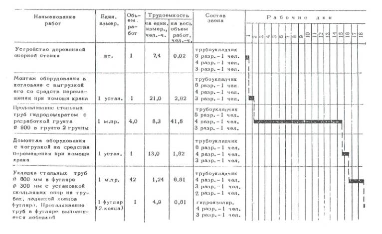 Приложение 2Технические характеристики стреловых поворотных крановКран СПК-1000 1. Грузоподъемность, кг - 1000 2. Вылет стрелы, м - 3,5 3. Высота подъема крана от уровня колес, м - 4,3 4. Максимальный ход крюка, м - 25 5. Скорость подъема и опускание груза, м/мин - 12,5 6. Угол поворота стрелы, град. - 360 7. Общая масса крана с противовесом, кг - 3300 Кран СПК-2000-2 1. Грузоподъемность, кг - 2000 2. Вылет стрелы, м - 7,8 3. Высота подъема крюка от подошвы крана, м - 4,0 4. Скорость подъема и опускания груза, м/мин - 20 5. Скорость поворота, об/мин - 0,7 6. Масса крана без противовеса транспортного устройства, кг - 4800 Приложение 3Технические характеристики пневмопробойников гидравлического пресса и установки для проколаПневмопробойник ИП-4601 1. Диаметр пробиваемых скважин, мм: а) без расширителя - 135 б) с расширителями - 200; 250 2. Длина пневмопробойника, мм - 1587 3. Масса (без шланга), кг - 80 4. Вид подаваемой энергии - сжатый воздух 5. Номинальное давление сжатого воздуха, атм - 6 6. Расход воздуха, м3/мин - 3 7. Скорость пробивания скважин, м/час: а) в грунтах 1 категории - 30 - 60 б) в грунтах 2 категории - 15 - 30 в) в грунтах 3 категории - 8 - 15 8. Длина пробиваемой скважины, м - до 50 Пневмопробойник ИП-4603 (реверсивный) 1. Диаметр пробиваемых скважин, мм а) без расширителя - 130 б) с расширителями - 200; 300 2. Длина пневмопробойника, мм - 1550 3. Масса (без шлангов), кг - 80 4. Вид подаваемой энергии - сжатый воздух 5. Номинальное давление сжатого воздуха, атм - 8 6. Расход воздуха, м3/мин - 3,5 7. Скорость пробивания скважин, м/час: а) в грунтах 1 категории - 40 - 60 б) в грунтах 2 категории - 20 - 40 в) в грунтах 3 категории - 10 - 20 8. Длина пробиваемой скважины, мм - до 50 Пневмопробойник ИП-4605 (реверсивный) 1. Диаметр пробиваемых скважин, мм: а) без расширителя - 95 б) с расширителем - 180 2. Скорость пробивания скважин в зависимости от свойств грунта, м/час - 1 - 50 3. Давление сжатого воздуха, атм - 0,8 4. Расход сжатого воздуха, м3/мин - 4,0 5. Габаритные размеры (без расширителя и шлангов), мм: длина - 1500 диаметр - 95 6. Масса (без расширителя и шлангов), кг - 55 Пресс гидравлический БГ-3 1. Рабочая площадь поперечного сечения 2 цилиндров, см2 - 100 2. Рабочий ход цилиндра, мм - 500 3. Скорость перемещения цилиндров, м/мин - 1,2 4. Время, в течение которого совершается один рабочий ход цилиндров, мин - 0,42 5. Усилие, развиваемое прессом, т - 3,0 8. Длина проходки, м - до 30 7. Скорость проходки, м/смену - 15 - 30 Техническая характеристика установки Главмосстроя для прокола 1. Диаметр прокладываемых труб (Дусл.), мм - 200 - 400 2. Длина прокола грунта, м - 20 - 45 3. Средняя скорость прокола грунта, м/смену - 25 4. Упорная стенка - инвентарная металлическая - в комплекте 5. Наибольшая масса элемента установки (рама), т - 2,0 6. Габариты установки, мм: длина - 8800 ширина - 1600 высота - 2200 7. Суммарная масса установки, т - 4,8 8. Обслуживающее звено, чел. -2 Приложение 4Техническая характеристика установки Главмосстроя для прокладки труб Ø 900 мм способом продавливания