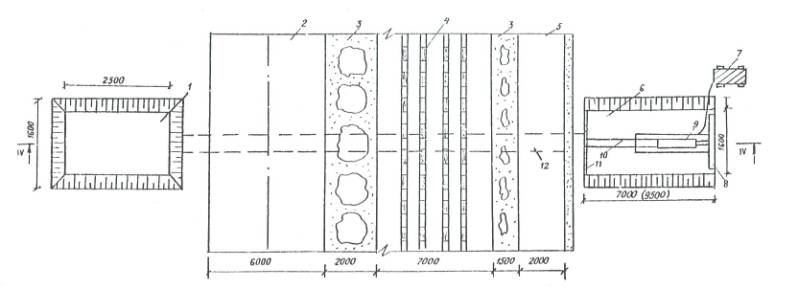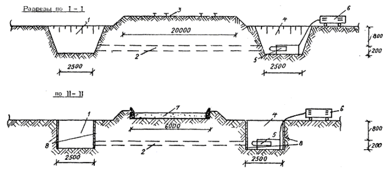 1 - приемный котлован; 2 - автомобильная дорога; 3 - котлован для установки пресса; 4 - передвижная эл. станция; 5 - упорная плита с распорками; 6 - гидравлический пресс БГ-3; 7 - пробиваемая скважина
