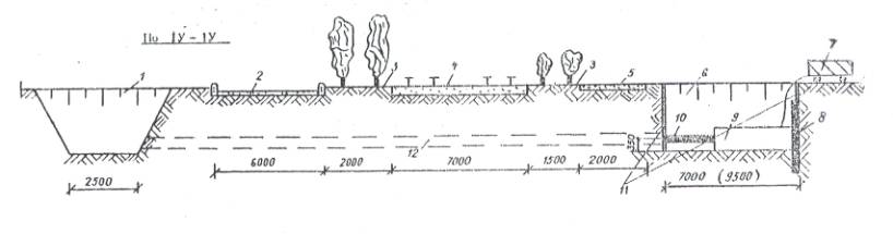 1 - приемный котлован; 2 - автомобильная дорога; 3 - зеленые насаждения; 4 - трамвайные пути; 5 - тротуар; 6 - котлован для прокольной установки; 7 - передвижная эл. станция; 8 - инвентарная упорная плита; 9 - прокольная установка Главмосстроя; 10 - прокольная труба; 11 - крепление откоса; 12 -трасса для прокола