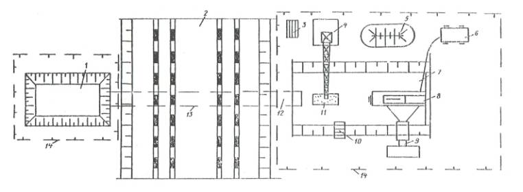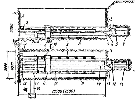 1 - стенка упорная; 2 - лебедка; 3 - крепление откосов; 4 - ножевая секция; 5 - трос втаскивания; 6 - трос вытаскивания; 7 - трос отрезки; 8 - основание; 9 - упорные кулачки; 10 - полуавтомат защелки; 11 - стакан; 12 - стопоры тележки; 13 - тележка; 14 - труба длиной 6,0 м; 15 - трубы упорные; 16 - траверса; 17 - домкрат; 18 - насосная станция; 19 - башмак