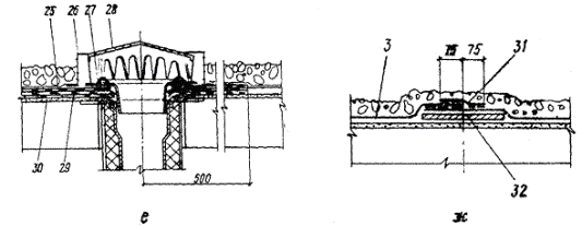 Рис. 2. Схема конструктивных решений обустройства мест примыканий кровельного ковра: а - к кирпичному парапету; б - в местах выхода на крышу из машинного помещения; в - вдоль карниза машинного помещения; г - к фановым стоякам; д - к вентиляционной шахте; е - в местах установки водоприемной воронки; ж - в местах стыковки ковров на смежных захватках; 1 - пригрузочный слой; 2 - разделительный слой; 3 - водоизоляционный сборный ковер; 4 - защитный фартук; 5 - фартук из оцинкованной кровельной стали; 6 - герметизирующая мастика с окраской; 7 - антисептированная деревянная рейка; 8 - сборный (монолитный) бетонный переходной наклонный бортик; 9 - подстилающий слой; 10 - несущая плита покрытия; 11 - герметизирующая нетвердеющая мастика; 12 - цементно-песчаный раствор; 13 - поризованный вкладыш; 14 - сборная железобетонная плита; 15 - слив из оцинкованной кровельной стали; 16 - антисептированный деревянный брусок; 17 - Т-образный кровельный костыль; 18 - сетка с антикоррозийным покрытием; 19 - подкладка из полимерного материала; 20 - фартук из армогидробутила; 21 - стальная скрутка; 22 - фановый стояк; 23 - патрубок из асбестоцементной трубы; 24 - обжимной хомут с резиновой прокладкой; 25 - двухслойная косынка из гидробутила и стеклосетки; 26 - перфорированное кольцо; 27 - прижимное кольцо воронки; 28 - водосточная воронка; 29 - подкладка из гидробутила; 30 - выравнивающий слой цементного раствора; 31 - накладка; 32 - подкладка из мягкой ДВП 2.6. Очистка основания включает удаление мелких острых предметов /кирпичного и бетонного боя, щебня и др./, заглаживание цементно-песчаным раствором острых выступов бетона, раковин /глубиной более 20 мм/ и откосов. Устройство подстилающего /выравнивающего/ слоя выполняется засыпкой увлажненного песка толщиной не более 20 мм. Подают цементно-песчаный раствор и песок на покрытие башенным краном в совковых бадьях и контейнерах для сыпучих материалов конструкции НИИСП Госстроя УССР, разравнивают скребками. 2.7. Усиливают кровельный ковер, наклеивая на основание подкладки из гидробутила по слою мастики МБК (расход 1,2 - 1,5 кг/м2): в местах установки водоприемных воронок - косынки размером 1´1 м; вдоль карнизов после устройства карнизных свесов из оцинкованной кровельной стали - полосы шириной 0,4 м. 2.8. Подготовка пазов примыканий заключается в очистке полостей от пыли и грязи с продувкой сжатым воздухом и огрунтовке их грунтовочным составом за два раза. Каждый последующий слой наносится после высыхания предыдущего. Грунтовочный состав приготавливается из смеси битума марки БН 70/30, гермабутила УМ типа Б по РСТ УССР 5018-86 и уайт-спирита при соотношении по массе 3:1:6. Расход состава - 0,15 кг/м2 на каждый слой. Грунтовку наносят удочкой агрегата СО-150 с центральной подачей сжатого воздуха, работающего в комплекте с компрессором СО-7Б. 2.9. К устройству сборной кровли разрешается приступить только после нанесения на основание покрытия маячных меток (направляющих линий) для привязки сборного ковра к месту его укладки. Маячные метки наносятся масляной краской, мелом или укладкой деревянных реек в местах привязочной установки траверсы с ковром и в направлении укладки ковра. Метки наносят по продольной оси траверсы и по одной из граней рулона ковра. Привязка траверсы и направление укладки ковра устанавливаются проектом производства работ. 2.10. Укладку сборных ковров начинают с уча