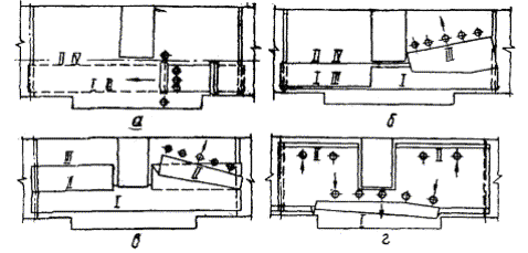 Рис. 1. Схема производства кровельных работ: а, б, в, г - последовательность операций по развертыванию сборного кровельного ковра; 1 - контейнер для доборных кровельных элементов; 2 - контейнер для сердечника с ковром; 3 - агрегат для герметизационных работ; 4 - контейнер для сыпучих материалов; 5 - контейнер для рулонных материалов; 6 - башенный кран; 7 - траверса с сердечником для укладки сборного ковра; 8 - бадья для цементного раствора 2. ОРГАНИЗАЦИЯ И ТЕХНОЛОГИЯ СТРОИТЕЛЬНОГО ПРОЦЕССА2.1. Для рациональной организации строительного процесса вся крыша разделяется на захватки, которые должны соответствовать архитектурно-планировочным решениям здания (блок-секциям, участкам водосбора). 2.2. До начала устройства кровли в пределах одной захватки должны быть выполнены следующие работы: заделаны и тщательно заглажены стыки железобетонных плит покрытия цементно-песчаным раствором; пробиты в плитах покрытия отверстия для фановых стояков, водопроводных воронок и т.п.; срезаны монтажные петли плит покрытий и сглажены острые концы петель; выполнена планировка поверхности к водоприемным воронкам внутренних водостоков по длине примыкающей к ним ендовы; вдоль парапетных стен и выступающих конструкций покрытия (вентиляционных шахт, фановых стояков, люков, помещений машинных отделений лифтов и т.п.) установлены монолитные переходные наклонные бортики из цементно-песчаного раствора или сборные из легкого бетона; установлены и закреплены хомутами патрубки, в которые вставляют чаши водоприемных воронок, предварительно очищенные и окрашенные битумным лаком БТ-577 по ГОСТ 5631-79; завершен монтаж и подготовка основания плит покрытия над помещением машинного отделения лифтов; установлена электрозащита в конструкции покрытия; очищена поверхность основания покрытия от мусора и выступающих наплывов из бетона и цементно-песчаного раствора (допустимая высота выступающих конструкций покрытия - до 250 мм); установка вентиляционных блоков или труб выполняется после укладки ковра; доставлены в зону работ по устройству сборной кровли необходимые инструменты и инвентарь. При отсутствии указаний в проекте для планировки поверхности следует применять цементно-песчаный раствор марки не ниже 50 или керамзитобетон марки 35. 2.3. Для устройства сборной ковровой кровли применяются конструкции водоизоляционных ковров типа Т-I, Т-II или Т-III. Конструктивные решения кровли должны соответствовать приведенным на рис. 2. Ковры состоят из водоизоляционного и подкладочного слоев. Водоизоляционный слой выполняется из гидробутила I по ТУ 21-27-96-85, гидробутила К или армогидробутила АК по ТУ 21-27-96-82; подкладочный слой - из рубероида, пергамина, битуминозной бумаги. В качестве пригрузочного материала следует применять гравий (щебень) по ГОСТ 8268-82 обеспыленный, чистый с крупностью зерен 5 - 25 мм, марки по морозостойкости не ниже 100. До засыпки гравия устраивают разделительный слой из подкладочного рубероида по ГОСТ 10923-82 или кровельного пергамина по ГОСТ 2697-83. В качестве подстилающего слоя следует применять мелкозернистый песок по ГОСТ 8735-75 или крупнозернистый песок по ГОСТ 8736-85. Для устройства дополнительных слоев применяют полотно клееное прокладочное (прокламелин) и тканую сетку марок ССС, СС-I. В качестве клеящих мастик должны применяться бутилкаучуковая мастика МБК по ТУ 21-27-90-83