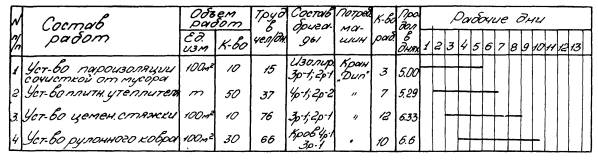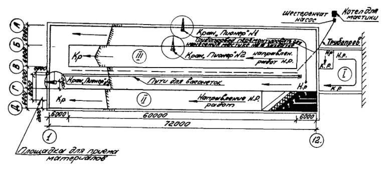 Кровельные работы на покрытии промздания осуществляются методом с применением средств комплексной механизации. До начала кровельных работ площадь покрытия разбивается на отдельные участки и захватки. Каждая захватка разбивается на делянки, работы на которых выполняются отдельными последовательными технологическими операциями с разрывами во времени между ними не более 1 суток. Работы ведутся в направлении навстречу подаче материалов в первую очередь на фонарях, а затем на участке между фонарями. Подъем материалов на покрытие кроме мастик производится в контейнерах емк. 0,2 м3 с помощью крана. Подвозка материалов на фонарях выполняется 2-х колесными тележками на резиновом ходу. Мастики приготавливают на централизованной установке и на объект доставляют в специальных установках. Для транспортировки, подачи на кровлю и нанесения мастики на основание используют установку конструкции управления строительства «Орелстрой», которая снабжена подогревающим устройством, насосом для подачи мастики и компрессором. Нанесение мастики на основание производится форсункой. Подробное описание методов труда и схемы организации рабочих мест звеньев см. карты организации труда на пароизоляцию, теплоизоляцию, цементную стяжку и устройство рулонного ковра, разработанные трестом «Оргтехстрой». График производства работ