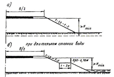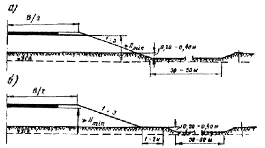 где Н - мощность слабого слоя; Сk - коэффициент консолидации, определяемый испытанием образцов грунта на консолидацию, см2/час. Если это время окажется значительно больше года, необходимо предусмотреть специальные мероприятия для ускорения осадки: либо применить метод перегрузки, заключающийся в отсыпке земляного полотна заведомо выше проектной отметки и последующем снятии лишнего грунта после достижения предполагаемой осадки, либо в устройстве дренажных прорезей и вертикальных песчаных дрен. Кроме того, можно рекомендовать метод стадийного устройства дорожных одежд, при котором капитальные покрытия устраивают после затухания осадки, что гарантирует их устойчивость. При трассировании дороги должны учитываться затраты, направленные на обеспечение устойчивости основания и земляного полотна, на уменьшение и ускорение его осадки, а также экономия, получаемая за счет сокращения протяженности дороги. В процессе инженерно-геологических обследований мокрых солончаков измеряют глубину слабого слоя или, при значительной его величине, мощность активной зоны. При этом определяют влажность, плотность и отбирают образцы для последующих сдвиговых и компрессионных испытаний. Результаты этих испытаний позволят установить тип мокрого солончака в соответствии с табл. 1, а следовательно, и необходимость тех или иных расчетов при проектировании. Степень и характер засоления определяют только для поверхностных слоев мокрых солончаков I типа (в случае их использования для возведения земляного полотна) и для грунта внетрассовых резервов на глубину их разработки при возведении насыпей из привозного грунта. При проведении изысканий в районе распространения мокрых солончаков должны быть установлены наиболее неблагоприятные значения их влажности, степени засоления и уровня грунтовых вод. В целях правильного назначения конструкции земляного полотна уровень грунтовых вод и влажность грунтов определяют в период наибольшего увлажнения (март - апрель). При проектировании дорог на мокрых солончаках I типа влажность грунтов и уровень грунтовых вод определяют в летний период года (период максимального подсыхания грунтов) с целью выявления возможности заложения боковых резервов и назначения их глубины. Степень и качественный характер засоления устанавливают в период наибольшего соленакопления в верхних горизонтах (июль - август). Необходимо также провести дополнительные рекогносцировочные обследования в тот период года, условия которого не были охвачены основными изысканиями. 3. Конструкции земляного полотна на мокрых солончакахКонструкции земляного полотна назначают в зависимости от типа мокрого солончака. При наличии у мокрых солончаков I типа верхнего, более сухого, слоя грунта насыпь возводится из боковых резервов (рис. 1). Эти конструкции отличаются от рекомендуемых ВСН 97-63 незначительной глубиной резервов (20 - 40 см), ограничиваемой уровнем грунтовых вод и влажностью грунта. Ширина резервов определяется объемом грунта, необходимого для возведения насыпей. Рис. 1. Конструкция земляного полотна на мокрых солончаках I типа: а - при наличии верхнего сухого слоя грунта или возможности естественного его осушения; б - при невозможности отвода воды из резерва Таблица 3