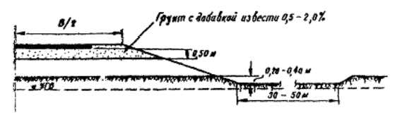 Примечание. При возведении насыпей из сильнозасоленных грунтов пылеватых разновидностей сульфатного засоления на пониженных местах рационально увеличивать возвышение низа дорожной одежды над уровнем грунтовых вод до 2,3 - 2,4 м за счет повышения насыпи или понижения уровня грунтовых вод при помощи дренажа. Прослойку устраивают из щебня, гравия или дорожного местного каменного материала с размером фракции 5 - 70 мм, толщиной 15 - 20 см. В случае отсутствия каменных материалов для прослойки используют крупнозернистый песок толщиной 15 - 20 см. Капилляропрерывающая прослойка может быть изолирующей, из грунта, обработанного битумом или нефтью, толщиной 5 - 8 см. При возведении земляного полотна из переувлажненных грунтов целесообразно устраивать прослойки дренирующих типов, так как они одновременно служат поглощающими. Крутизна откосов насыпей, возводимых из засоленных грунтов боковых резервов, принимается 1:3, крутизна откосов насыпей из привозных грунтов - 1:1,5 (при слабозасоленных грунтах) и 1:2 (при средне- и сильнозасоленных). Рис. 4. Конструкция земляного полотна на мокрых солончаках при невозможности минимального возвышения дорожной одежды над уровнем грунтовых вод или длительного стояния воды При проектировании земляного полотна на мокрых солончаках II типа для повышения устойчивости основания следует уменьшить крутизну откосов путем соответствующих расчетов. 4. Особенности производства работ по возведению земляного полотна на мокрых солончакахМетод возведения земляного полотна на мокрых солончаках определяется его конструкцией и физико-механическими свойствами грунта. Для возведения насыпей из боковых резервов на мокрых солончаках I типа с близким уровнем грунтовых вод рекомендуется использовать бульдозеры ввиду их лучшей проходимости. Бульдозеры разрабатывают грунт резерва и перемещают его в насыпь; разравнивание, планировку и уплотнение насыпи ведут обычным комплектом машин. При возведении насыпей из привозного грунта его разрабатывают в карьере экскаватором и перемещают автомобилями-самосвалами или скреперами: на 500 м прицепными скреперами с ковшом емкостью 6 м3 и на 3000 м - самоходными скреперами с емкостью ковша 9 - 10 м3. Отсыпку насыпи ведут с «головы». Насыпь отсыпают вначале выше проектной отметки, но не на полную ширину земляного полотна, затем бульдозерами раздвигают грунт в стороны и одновременно его уплотняют. При естественной влажности, превышающей указанную в табл. 3, каждый слой грунта после разравнивания перед укаткой подсушивают на воздухе. При значительной влажности грунта и неэффективности естественного подсушивания или при неблагоприятных погодных условиях рекомендуется применять добавки извести или цемента. Технология работ в этом случае заключается в следующем. Из резервов бульдозерами отсыпают и планируют слой переувлажненного грунта толщиной 20 - 30 см. Грунт размельчают 1 - 2 проходами фрезы. Известь или цемент укладывают специальным распределителем сошникового типа или цементораспределителем. При проходах фрезы грунт перемешивается с добавками. Обработанный грунт рационально уплотнять катками на пневматических шинах с учетом пониженной сопротивляемости грунта деформированию в первый период после введения добавок. Капилляропрерывающие прослойки в земляном полотне устраиваются 