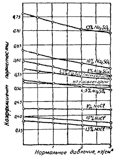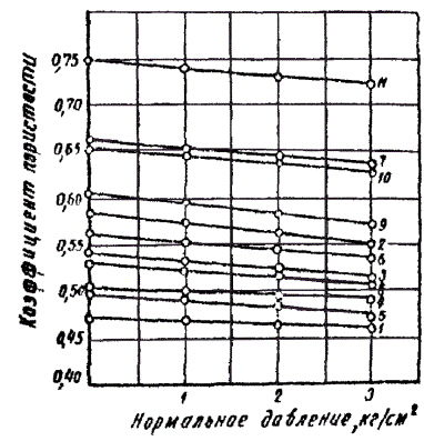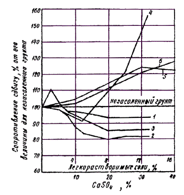 Исследованиями установлено, что присутствие 10 % гипса в легком пылеватом суглинке не влияет на сопротивление сдвигу. С увеличением количества гипса до 30 - 40 % сопротивление грунта сдвигу увеличивается на 20 - 28 % (рис. 2). Размеры кристаллов гипса в исследованном диапазоне 2 - 0,14 мм не оказывают влияния на сопротивление грунта сдвигу. Грунты, содержащие 30 - 40 % гипса, по сопротивлению сдвигу, как одному из важнейших свойств, определяющих степень устойчивости земляных сооружений, могут быть использованы для строительных целей. Результаты исследований сильно-, избыточнозасоленных и гипсированных грунтов, отобранных из земляного полотна участков наблюдений на дорогах, построенных в Хорезмской, Бухарской областях Кара-Калпакской АССР и Голодной степи, свидетельствуют о том, что сдвигающие усилия, сцепление и угол внутреннего трения этих грунтов незначительно отличаются от аналогичных характеристик искусственно засоленных грунтов с содержанием 3 - 5 % хлоридов или сульфатов. Избыточнозасоленный грунт № 5 (табл. 5) характеризуется более высокими значениями сопротивления сдвигу, сцепления и угла внутреннего трения по сравнению с модельными засоленными грунтами, содержащими 13 % NaCl или 13 % Na2SO4 × 10H2O. Для природных гипсированных грунтов, так же как и для искусственных моделей, характерно повышенное сопротивление сдвигу по сравнению с незасоленным грунтом. Неоднородность исследованных естественно засоленных грунтов по гранулометрическому составу и другим признакам не позволяют установить четкой закономерности влияния солей на сопротивление сдвигу. Влияние солей на компрессионные свойства грунтаВ связи с использованием засоленных грунтов в качестве строительного материала для возведения земляного полотна автомобильных дорог важно знать, как сжимается грунт под нагрузкой, а также и в условиях капиллярного увлажнения минерализованной водой. Влияние NaCl на сжимаемость грунта при нагрузке 3 кг/см2 начинает проявляться с дозировки 10 - 13 %; коэффициент пористости уменьшается на 5 - 6 % по сравнению с исходным засоленным грунтом до приложения нагрузки (рис. 3). Грунты с содержанием 4 - 5 % Na2SO4 × 10H2O при нагрузке 3 кг/см2 сжимаются на 7 % по сравнению с исходным засоленным грунтом до приложения нагрузки. С увеличением содержания этой соли от 8 до 13 % сжимаемость возрастает, а коэффициент пористости снижается на 8 - 10 %. Гипсированные грунты (40 % CaSO4) при нагрузке 3 кг/см2 сжимаются на 7 % по сравнения с этим же грунтом до приложения нагрузки. Большое практическое значение имеет сжимаемость естественно засоленных грунтов (рис. 4). Грунты, содержащие до 13 % NaCl, до 8 % Na2SO4 × 10H2O и 40 % CaSO4, уплотненные при оптимальной влажности до максимальной плотности, мало сжимаются при нагрузке 3 кг/см2. Следовательно, нет оснований опасаться появления в земляном полотне просадочных деформаций. Таблица 5 Сопротивление сдвигу естественно засоленных грунтов