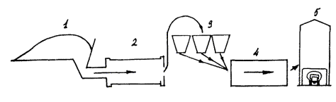 6. ПРОИЗВОДСТВО ВЯЖУЩИХ6.1. Неорганические вяжущие вещества на основе отходов промышленности производят путем совместного помола основного компонента с минеральной активизирующей добавкой. В случае, если компоненты вяжущего значительно различаются по твердости (по шкале Мооса), рекомендуется либо раздельный их помол с последующим перемешиванием, либо введение более слабого компонента на 2-м этапе помола. Размалывание вяжущих производят в шаровых или стержневых мельницах непрерывного действия, производительностью не ниже 5 т/час. 6.2. Размещение цеха производства вяжущего должно быть обосновано технико-экономическим расчетом. 6.3. Основными узлами помольной установки для производства вяжущих являются: сушильный барабан типа МГ-1, дозировочное отделение, двухкамерная шаровая мельница СМ-1456 или СМ-6000, силосный склад и оборудование для обеспыливания воздуха. Технологическая схема установки представлена на рис. 6.1. Рис. 6.1. Технологическая схема производства вяжущих: 1 - склад основного сырья; 2 - сушильный барабан; 3 - дозировочное отделение; 4 - шаровая мельница; 5 - силосный склад вяжущего 6.4. Производство вяжущих на основе отходов промышленности и местных материалов включает следующие технологические процессы: а) транспортирование компонентов вяжущего и активизирующих добавок и складирование их на территории производственного цеха, б) сушка основных компонентов, в) подача компонентов в накопительные бункера помольной установки, г) дозирование и помол минеральных составляющих, д) введение активизирующей добавки на определенном этапе помола, е) охлаждение и складирование вяжущего, ж) рекуперация мельчайших фракций вяжущего. 6.5. При использовании материала с отдельными фракциями крупнее 20 - 40 мм следует предусмотреть предварительное дробление перед загрузкой в мельницу. 6.6. В приложении 1 приведено описание установки по производству вяжущего на шлаке Назаровской ГРЭС в Красноярскавтодоре. 7. КОНТРОЛЬ КАЧЕСТВА, ХРАНЕНИЕ И ТРАНСПОРТИРОВАНИЕ ВЯЖУЩИХ7.1. Высокое качество вяжущих на основе отходов промышленности и местных материалов может быть обеспечено путем четкой организации постоянно действующего технического контроля. 7.2. Основными задачами технического контроля являются: а) контроль за качеством сырьевых материалов и добавок - активизаторов твердения, б) контроль за соблюдением всех технологических операций на каждой стадии производственного процесса, в) контроль за соответствием качества выпускаемой продукции требованиям, предъявляемым к вяжущим, г) контроль за хранением и транспортированием готовой продукции. 7.3. Исходные материалы контролируют по химическому составу и содержанию органических примесей. 7.4. Один раз в смену контролируют весовое содержание компонентов вяжущего и активизирующих добавок. 7.5. Каждую партию вяжущего объемом 150 т контролируют по следующим параметрам: а) тонкость помола, б) равномерность изменения в объеме при твердении, в) прочность при изгибе и сжатии, г) сроки схватывания вяжущего. Методы испытания вяжущих приведены в разделе 3. 7.6. При контрольной проверке марки вяжущего допускается отклонение прочности образцов 90-суточного возраста до 5 % ниже марочной. 7.7. Периодически контролируют работу основных приборов и механизмов: автоматических дозаторов, сушильного агрегата, шаровую мельн