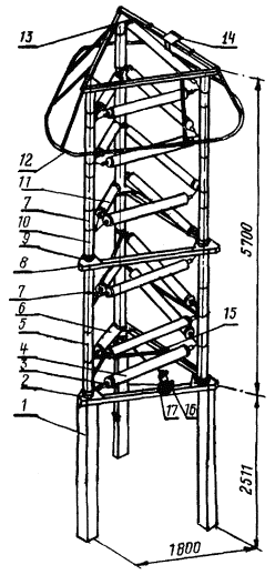 строительства Одесский филиал УТВЕРЖДАЮ Главный инженер ССО «Электромонтаж» _______ Б.П. Городецкий «___» _____________ 1989 ТЕХНОЛОГИЧЕСКАЯ КАРТА Москва 1990 1. ОБЛАСТЬ ПРИМЕНЕНИЯТехнологическая карта монтажа вентильных разрядников типа РВМК на напряжение 330 - 750 кВ предназначена для использования при монтаже разрядников на открытых распределительных устройствах, при составлении проектов организации строительства (ПОС) и проектов производства электромонтажных работ (ППР). Разрядники предназначены для защиты изоляции электрооборудования переменного тока от атмосферных и коммутационных перенапряжений. Разрядники 330 (рис. 1) и 500 кВ (рис. 2) собираются в объемную конструкцию, разрядник 750 кВ (рис. 3) - одноколонковый. Технологическая карта содержит указания по организации и технологии монтажа, перечень механизмов, инструментов и приспособлений, сведения о затратах материалов, калькуляции трудовых затрат, графики производства работ и потребности в рабочих. В карте принято, что работы, связанные с монтажом разрядников, производятся непосредственно на монтажной площадке, у места их установки. Количество одновременно поднимаемых при укрупнительной сборке элементов (изоляторов), определенное настоящей картой, ограничено заводом-изготовителем разрядников. Все данные в карте приведены для монтажа одной группы (трех фаз) разрядников. Трудозатраты на наладочные работы графиком монтажа и калькуляцией не учтены. Технологическая карта разработана в соответствии с «Методическими указаниями по разработке типовых технологических карт в строительстве». М., 1987, ЦНИИОМТП Госстроя СССР. Рис. 1. Вентильный комбинированный разрядник РВМК-330П: 1 - опора; 2 - рама нижняя; 3 - изолятор ИОР-10/750; 4 - элемент искровой; 5 - изолятор опорный ОНСУ-400-1000; 6 - элемент вентильный; 7 - изолятор КО-15С; 8 - рама промежуточная; 9 - плита шарнирная; 10 - изолятор КО-35СУ; 11 - элемент основной; 12 - кольцо экранирующее; 13 - рама верхняя; 14 - контакт; 15 - перемычка; 16 - регистратор срабатывания; 17 - имитатор Рис. 2. Вентильный разрядник РВМК-500П: 1 - опора; 2 - рама нижняя; 3 - изолятор КО-20С; 4 - элемент вентильный; 5 - элемент искровой; 6 - рама промежуточная большая; 7 - плита шарнирная; 8 - изолятор КО-15С; 9 - изолятор КО-35С; 10 - рама промежуточная малая; 11 - элемент основной; 12 - кольцо экранирующее; 13 - рама верхняя; 14 - контакт; 15 - перемычка; 16 - регистратор срабатывания; 17 - имитатор Рис. 3. Разрядник вентильный РВМК-750М: 1 - опора; 2 - регистратор; 3 - имитатор; 4 - элемент; 5 - кольцо экранирующее; 6 - пластина контактная; 7 - плита 2. ОРГАНИЗАЦИЯ И ТЕХНОЛОГИЯ ВЫПОЛНЕНИЯ РАБОТ2.1. Общие указания. 2.1.1. К началу монтажных работ должны быть выполнены: подъезды к месту установки разрядников; опоры под разрядники, а также планировка прилегающей к ним территории; площадка с твердым покрытием или настил для установки элементов и изоляторов; силовая сеть 380/220 В; молниезащита ОРУ и заземляющее устройство. 2.1.2. Разрядники поставляются заводом в виде узлов, упакованных в деревянные ящики. При транспортировании разрядников и погрузо-разгрузочных работах следует руководствоваться указаниями маркировочных знаков на таре и соблюдать меры предосторожности, исключающие возможность повреждения элементов и других частей. Во избежание поломок ящиков при подъеме краном необходимо, чтобы стропы образовывали с горизонтальной плоскостью крышки ящика