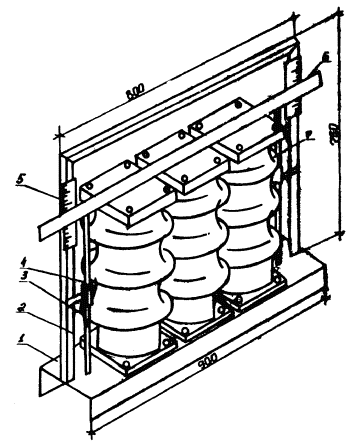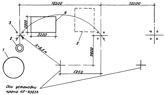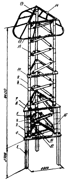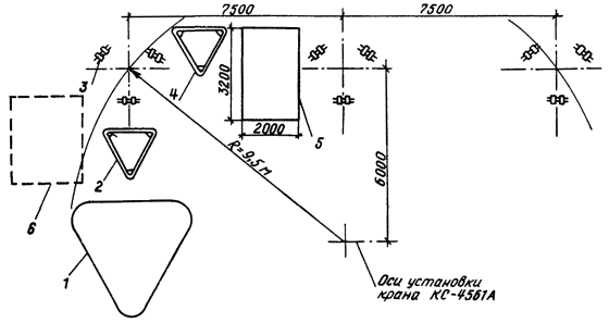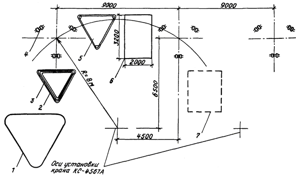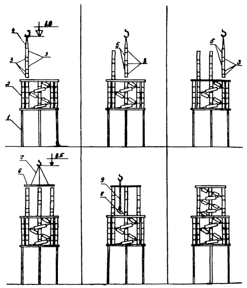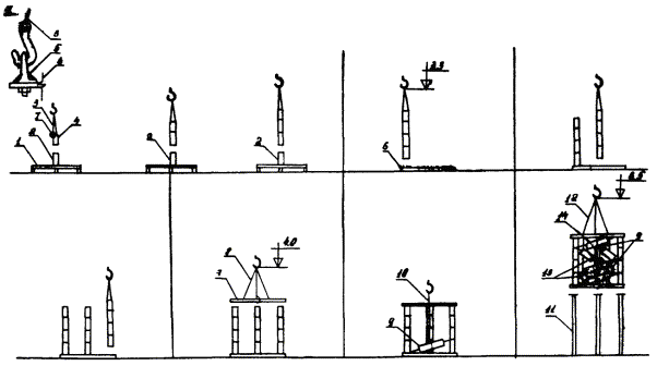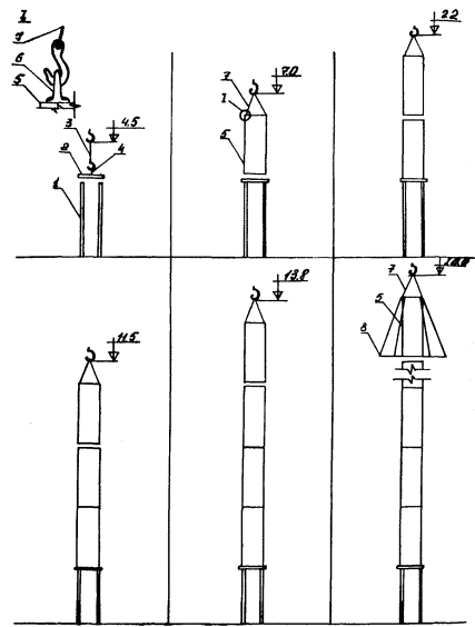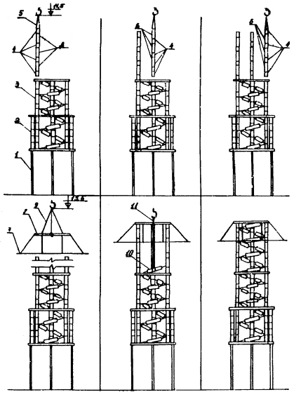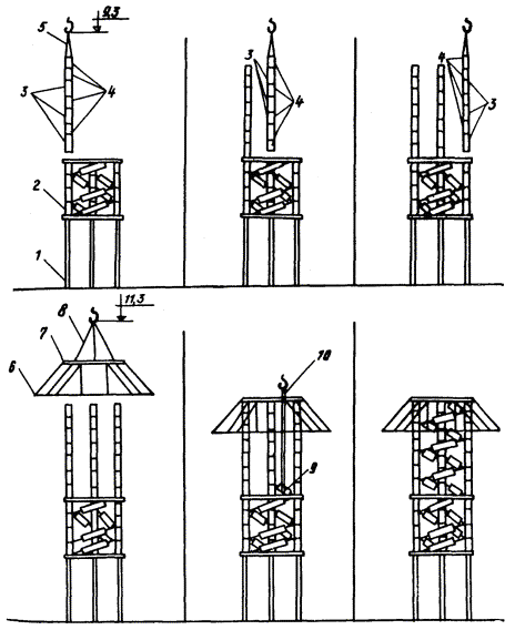 Рис. 5. План размещения оборудования и механизмов при монтаже разрядника РВМК-500П: 1 - кольцо экранирующее; 2 - рама промежуточная большая; 3 - рамы промежуточная малая и верхняя; 4 - опора; 5 - рама нижняя; 6 - настил из досок; 7 - площадка разгрузки ящиков с изоляторами и элементами Рис. 6. План размещения оборудования и механизмов при монтаже разрядника РВМК-750М: 1 - кольцо экранирующее; 2 - плита; 3 - опора; 4 - настил из досок; 5 - площадка разгрузки ящиков с изоляторами и элементами 2.2.3. Подготавливается деревянный настил для установки элементов и изоляторов. 2.2.4. Доставляются на строительную площадку монтажные механизмы, оборудование, инвентарные устройства и размещаются в соответствии со схемами, приведенными на рис. 4 - 6. Разрядники распаковываются. Расконсервируются узлы и детали. 2.2.5. Производится приемка разрядника в монтаж. Перед монтажом элементы и изоляторы испытываются согласно заводской инструкции (выполняет группа наладки). 2.3. Монтаж разрядника 330 кВ. Монтаж первого этажа разрядника (рис. 7). 2.3.1. В углах нижней рамы устанавливают и закрепляют три шарнирные плиты. Проверяют уровнем горизонтальность нижней рамы. 2.3.2. Выставляют двенадцать изоляторов на ровном гладком месте (дощатый настил) и комплектуют из них три комплекта по четыре изолятора (три изолятора ИОС-35-1000 и один - КО-15С) для окончательного выравнивания с помощью приспособления, показанного на рис. 8. Выравнивание производят с учетом устанавливаемых в колоннах плит для крепления элементов. Разницу высот изоляторов компенсируют металлическими пластинами (количество пластин должно быть минимальным). Для этого: устанавливают на основание приспособления три изолятора; опускают талрепами линейку на верхние фланцы изоляторов; заполняют зазоры между линейкой и фланцами изоляторов пластинами; закрепляют проволокой пластины на фланцах. 2.3.3. Собирают поочередно три колонны по четыре изолятора, устанавливают и закрепляют их на плитах нижней рамы таким образом, чтобы шарнир сохранял некоторую подвижность. Сборку колонн выполняют методом «подращивания» с использованием рым-болтов, стропа 2СК-0,5/0-0,5/К-0,4/900. В местах крепления рабочих элементов между изоляторами устанавливают плиты с серьгами. При этом между плитами и серьгами устанавливают специальные шайбы. 2.3.4. Устанавливают и закрепляют в углах промежуточной рамы с верхней стороны три шарнирные плиты. Оцинкованная плита (ИП.066.010) устанавливается со стороны подсоединения основного элемента. 2.3.5. Промежуточную раму поднимают (строп СКП 1-0,5/1500), устанавливают и закрепляют на колоннах изоляторов. Совмещение отверстий рамы и на фланцах верхних изоляторов достигается поворотом колонн в шарнирах. Проверяют вертикальность установки колонн изоляторов и горизонтальность установки средней рамы (при необходимости выравнивает прокладками). В случае непараллельности верхних фланцев изоляторов и горизонтальной плоскости рамы надевают шайбы или прокладки на отдельные (там, где необходимо) болты. После закрепления промежуточной рамы производят окончательную затяжку болтов шарнирных плит. Рис. 7. Монтаж первого этажа разрядника РВМК-330П: 1 - настил из досок; 2 - изолятор ИОС-35-1000; 3 - стропа 2СК-0,5/0-0,5/К-0,4/900; 4 - изолятор КО-15С; 5 - рым-болт М16; 6 - рама нижняя; 7 - рама промежуточная; 8 - строп СКП1-0,5/1500; 9 - элемент искровой; 10 - строп типа СКК из капронов