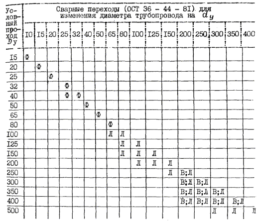 Примечание. Детали, предусмотренные стандартом, отмечены знаком «х». Таблица 2 Типы и условные проходы переходов мм
