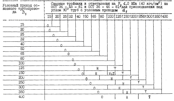 Примечание. В табл. 3 - 7 типы соединений, рекомендуемые к применению, обозначены: Т - сварной тройник; О - неусиленное ответвление (врезка); Н - ответвление (врезка), усиленное накладкой. 4. Материал деталей и температурные пределы их применения следует принимать такими же, как и для соединяемых труб. 4.1. Типоразмеры и пределы применения по условному давлению соединяемых труб указаны в табл. 8. 4.2. Пределы применения по условному давлению для деталей следует принимать: гнутых отводов - как для труб, из которых они изготовлены; секционных отводов - как для труб, из которых они изготовлены, но не свыше 6,3 МПа (63 кгс/см2); плоских заглушек - по ОСТ 36-47-81; ребристых заглушек - 4 МПа (40 кгс/см2); вальцованных и формованных переходов на концах труб - как для прямых труб диаметром Dу; лепестковых переходов - как для прямых труб диаметром Dу, но не свыше 1,6 МПа (16 кгс/см2); неусиленных ответвлений и ответвлений, усиленных накладками, - по табл. 3 - 7 настоящего стандарта при толщине стенки по табл. 8, сварных тройников - по табл. 4 - 7 настоящего стандарта и ОСТ 36-46-81. Примечания: