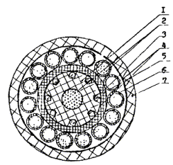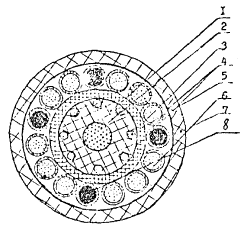 Строительная длина кабеля должна быть не менее 2200 м. Допускается сдача кабеля длиной не менее 1000 м в количестве не более 30 % от общей длины сдаваемой партиих). х) До 01.01.88 г. строительная длина устанавливается не менее 1000 м, при этом допускается сдача кабеля длинами не менее 500 м и в количестве 10 % от общей длины сдаваемой партии. Оптический кабель ОЗКГ-1-4/4 (8/4) имеет следующую конструкцию: центральный профилированный элемент должен быть выполнен из поливинилхлоридного пластиката и армирован терлоновыми нитями или нитями СВМ. В каждый паз профилированного элемента должно быть уложено одно оптическое волокно. Профилированный элемент должен быть обмотан фторопластовой или полиэтилен-терефталатной лентой. Поверх обмотки должна быть наложена внутренняя оболочка из поливинилхлоридного пластиката. Поверх оболочки должен быть наложен повив из 8 - 14 армирующих элементов и четырех изолированных полиэтиленом медных жил диаметром (1,2±0,2) мм. По повиву армирующих элементов и медных жил должна быть наложена обмотка из фторопластовой или полиэтилен-терефталатной ленты или нити. Поверх обмотки должна быть наложена наружная защитная оболочка из полиэтилена, радиальной толщиной не менее 2,0 мм. Кабель ОЗКГ-1-4/4 (8/4) предназначен для использования в зоновых сетях связи, для прокладки в кабельной канализации, трубах, блоках и коллекторах, грунтах всех категорий, кроме подверженных мерзлотным деформациям, в воде при пересечении неглубоких болот, несудоходных и несплавных рек со спокойным течением воды (с обязательным заглублением в дно) ручным и механизированным способами и для эксплуатации при температуре окружающего воздуха от минус 40 до плюс 55 °С. Конструкция оптического кабеля ОЗКГ-1 показана на рис. 2. Рис. 2. Внутризоновый оптический кабель ОЗКГ-1: 1 - центральный профилированной стержень из поливинилхлорида; 2 - нити СВМ; 3 - оптическое волокно в защитном покрытии; 4 - скрепляющие ленты: 5 - внутренняя оболочка; 6 - армирующий стальной элемент; 7 - наружная оболочка из полиэтилена; 8 - медная жила. 1.2.3. Конструкция соединительной муфты. Сращивание строительных длин внутризоновых оптических кабелей производится с применением соединительной муфты ММОК-17/27, представляющей собой в состоянии поставки комплект деталей и материалов (АХПО.446.001), имеющий этикетку и упакованный в полиэтиленовый пакет. (Состав комплекта и назначение его деталей и материалов приведены в табл. 8). 1.3. Состав работ В состав работ, рассматриваемых картой, входят: - организационно-подготовительные работы; - условия производства монтажных работ; - подготовка объекта для производства работ; - монтаж соединительной муфты; - проверка герметичности смонтированной муфты; - ремонт соединительной муфты; - особенности монтажа соединительной муфты на кабеле, прокладываемом в кабельной канализации. 2. ОРГАНИЗАЦИЯ И ТЕХНОЛОГИЯ МОНТАЖНОГО ПРОЦЕССА2.1. Организация монтажных работ 2.1.1. До начала монтажа руководитель работ обязан изучить соответствующую техническую документацию, провести обследование района строительства, сопоставить план расположения соединительных муфт с реальными возможностями и получить необходимые монтажные материалы, инструмент, приспособления и инвентарь, проверить оснастку монтажно-измерительных машин и их работоспособность. Для осуществления оперативной связи в 