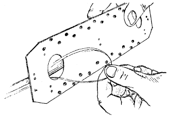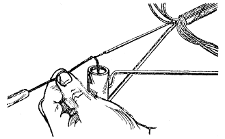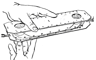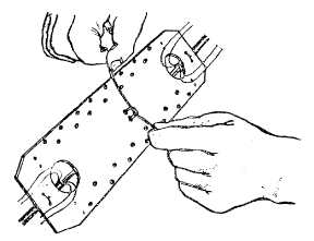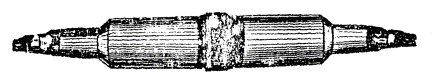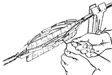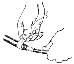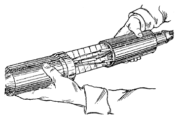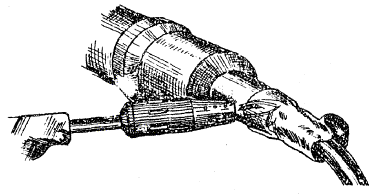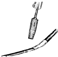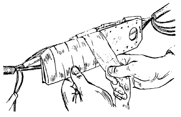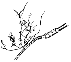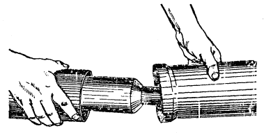 После остывания места сварки (примерно до 50 - 60 °С) стеклоленту удаляют. На рис. 24 показана смонтированная внутренняя муфта. Рис. 24. Смонтированная внутренняя полиэтиленовая муфта 2.7.3. После монтажа внутренней полиэтиленовой муфты ее проверяют на герметичность местным воздушным давлением. Для этого к цилиндрической части корпуса муфты, нагретой металлической пластиной, приваривают полиэтиленовый патрубок, входящий в комплект монтажных материалов (оболочка кабеля ТПП 10´2´0,5). Через патрубок в корпусе муфты делают прокол шилом или проплав нагретым металлическим стержнем. К патрубку присоединяют через осушительный бачок с селикагелем автомобильный насос. С помощью насоса в муфте создают избыточное воздушное давление примерно 96 кПа (1,0 кг/см2). Проверку производят прибором УЗТИ, а при его отсутствии обмыливанием муфты. После проверки муфту тщательно промывают водой от остатков мыла и затем протирают насухо. Полиэтиленовый патрубок срезают ножом. На отверстие в корпусе муфты накладывают вдвое сложенный отрезок сэвиленовой ленты длиной 30 - 35 мм (в сложенном виде) и закрепляют его нагретой металлической пластиной. Затем над этим участком устанавливают и усаживают второй оставшийся поясок ТУТ 100/50. 2.7.4. Закончив проверку герметичности внутренней муфты, приступают к монтажу внешней защитной муфты. Для этого внешнюю муфту устанавливают над внутренней (рис. 25). Рис. 25. Установка внешней полиэтиленовой муфты Стыкуемые участки деталей муфты и оболочку кабеля возле стыка зачищают ножом или металлической щеткой. На стык полумуфт наматывают 10 слоев полиэтиленовой ленты и поверх них четыре слоя стеклоленты. Умеренным пламенем газовой горелки или паяльной лампы производят наплавление полиэтиленовой ленты под стеклолентой. Временной режим сварки приведен в табл. 4. Таблица 4