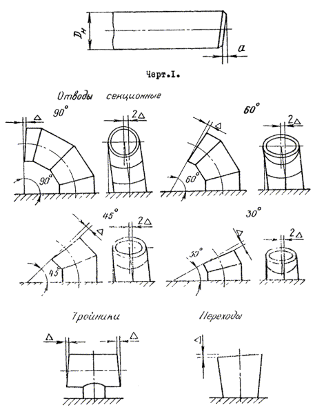 Приказом Министерства монтажных и специальных строительных работ СССР от 18 февраля 1981 г. № 45 срок введения установлен с 1 июля 1981 г. Несоблюдение стандарта преследуется по закону. Настоящий стандарт распространяется на гнутые и секционные отводы; плоские и ребристые заглушки; вальцованные, лепестковые и формованные переходы, неусиленные и усиленные накладками ответвления; тройники. 1. ТИПЫ, ОСНОВНЫЕ ПАРАМЕТРЫ И РАЗМЕРЫ1.1. Типы, основные параметры и размеры деталей должны соответствовать ОСТ 36-41-81 - ОСТ 36-48-81. 2. ТЕХНИЧЕСКИЕ ТРЕБОВАНИЯ2.1. Детали должны соответствовать требованиям настоящего стандарта и ОСТ 36-41-81 - ОСТ 36-48-81. 2.2. Детали необходимо изготавливать из труб и листового проката, соответствующих по марке стали и показателям качества соединяемым трубам. 2.3. Трубы и листовая сталь должны иметь маркировку и сопроводительную документацию в соответствии с требованиями стандартов и технических условий. 2.4. Для изготовления деталей трубопроводов трубы и листовую сталь без сопроводительной документации можно применять только после проведения испытаний и проверок, подтверждающих их соответствие требованиям, предъявляемым стандартами и техническими условиями на соединяемые трубы. 2.5. При сборке деталей под сварку должно быть обеспечено правильное взаимное расположение отдельных элементов. 2.6. В стыковых сварных соединениях деталей для трубопроводов, не подконтрольных органам Госгортехнадзора СССР, внутреннее смещение свариваемых кромок должно быть не более: для продольных швов лепестковых и вальцованных переходов - 0,15 толщины стенки, но не более 2 мм; для поперечных швов секционных отводов - 0,35 толщины стенки, но не более 3 мм. 2.6.1. Для деталей трубопроводов, подконтрольных органам Госгортехнадзора СССР, внутреннее смещение свариваемых кромок должно быть не более 10 % толщины стенки более тонкого элемента, но не более 3 мм. 2.7. Смещение кромок по наружной поверхности должно быть не более 30 % толщины наиболее тонкого элемента, но не свыше 5 мм. 2.7.1. Переход от большей толщины стенки к меньшей должен быть плавным под углом не более 15°. 2.8. Свариваемые кромки и прилегающие к ним поверхности со стороны сварки должны быть зачищены до металлического блеска на ширину 10 - 15 мм. 2.9. Сварку необходимо производить по ОСТ 36-39-80, а также в соответствии с производственными инструкциями, правилами Госгортехнадзора СССР, строительными нормами и правилами. 2.10. Форма кромок торцов деталей (за исключением заглушек) под приварку к трубопроводу должна соответствовать указанной в табл. 1. Таблица 1 Размеры и форма кромок торцов деталей мм