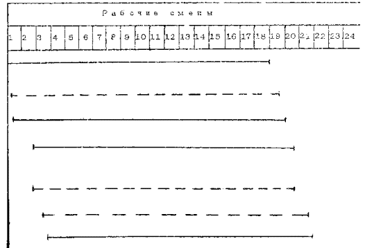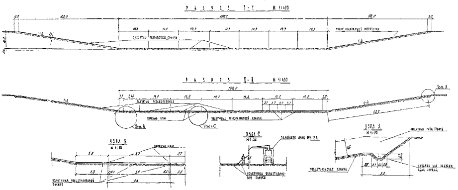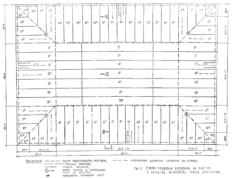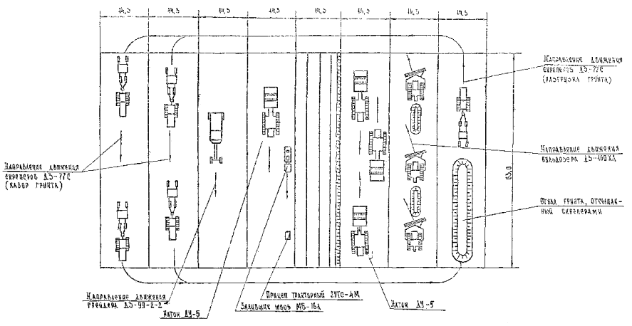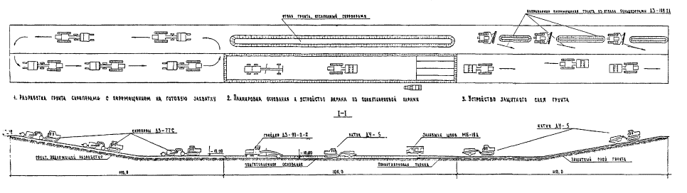 Читать Рис. 4. Схема производства работ по устройству грунтопленочного экрана на смежных захватках (участок I) Рис. 5 Схема производства работ по устройству грунтопленочного экрана на откосах (Участки II и III). Примечание: Размеры даны в метрах. 2.10. После планировки бульдозерами отсыпанного слоя грунта приступают к его уплотнению. Уплотнение ведется полуприцепными катками на пневматических шинах ДУ-5 (рис. 4, 5). Грунт естественной влажности уплотняют за восемь проходов по одному следу. 2.11. При завершении работ по устройству защитного слоя на откосах одновременно выполняют окончательное закрепление пленочного экрана по периметру водоема. При движении бульдозера снизу вверх по откосу канавку засыпают грунтом и затем грунт уплотняют катками. 2.12. Работы по устройству грунтопленочного экрана выполняет бригада из двух звеньев общей численностью 21 человек. Звено № 1, выполняющее земляные работы: машинист 6 разр. - 11 машинист 5 разр. - 5 Звено № 2, выполняющее работы по устройству пленочного экрана: машинист 5 разр. - 1 изолировщик 4 разр. - 1 изолировщик 3 разр. - 2 изолировщик 2 разр. - 1 2.13. График производства работ приведен в табл. 1. 2.14. Калькуляция трудовых затрат приведена в табл. 2. 2.15. Операционный контроль качества земляных работ выполняется в соответствии с требованиями СНиП III-8-76 «Правила производства и приемки работ. Земляные сооружения». Операционный контроль качества укладки и склейки пленки в полевых условиях проводят в соответствии с требованиями «Инструкции по проектированию и строительству противофильтрационных устройств из полиэтиленовой пленки для искусственных водоемов (СН 551-82)» п.п. 5.58...5 - 63. По окончании работ по устройству грунтопленочного экрана должны быть составлены акты освидетельствования скрытых работ стройлабораторией в соответствии с установленной формой на основании результатов испытаний. Схема операционного контроля качества работ приведена в табл. 3. 2.16. При производстве работ необходимо соблюдать правила по технике безопасности, приведенные в СНиП III-4-80 «Правила производства и приемки работ. Техника безопасности в строительстве», а также требования, изложенные ниже. Персоналу, обслуживающему заливщик швов МБ-16А запрещается: подключаться к внешней электросети без предварительного надежного заземления корпуса машины; производить заправку мастикой, регулировку, ремонт, очистку и смазку при работающем генераторе или включенной внешней электросети; производить запуск двигателя при включенной коробке отбора мощности; использовать этилированный бензин для промывки смесительной камеры от остатков мастики; включать насос промывки при открытом кране битумного насоса; работать при неисправных приборах электрозащиты. Работающие с битумно-полимерной мастикой должны быть ознакомлены со специальными требованиями противопожарной безопасности при работе с горючими и взрывчатыми веществами. Заливщик швов должен быть снабжен двумя огнетушителями, лопатой, кошмой. Для безопасного передвижения рабочих по пленке, уложенной по откосам, и во избежание ее сползания и вспучивания при ветренной погоде, края пленки должны быть надежно закреплены металлическими шпильками в канавке, проходящей по периметру водоема.