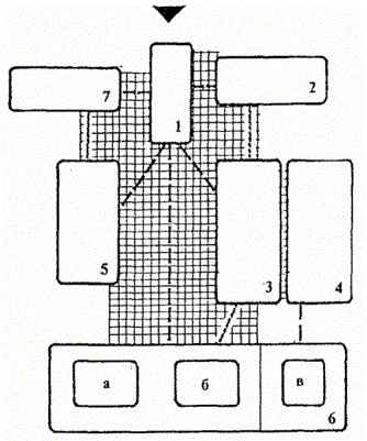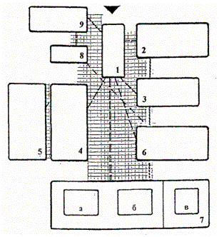 Рис. 2. Функционально-планировочная схема СПУО-2. 1. Вестибюльная группа помещений. 2. Помещения проживания. 3. Помещения питания. 4. Помещения общего образования. 5. Помещения профессионального образования. 6. Лечебно-реабилитационные помещения. 7. Помещения досугового и физкультурно-оздоровительного назначения: а. - физкультурно-оздоровительные; б. - досуговые; в. - дополнительное образование. 8. Медицинский изолятор. 9. Административно-бытовые помещения. Условные обозначения.