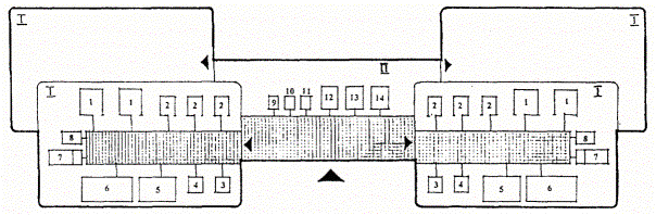 Помещения проживания. 5.34. Помещения проживания предусматриваются в СПУО-2. Рекомендуемые состав и площади помещений проживания приведены в таблице 5.2. 5.35. Помещения проживания следует размещать в соответствии с требованиями п.п. 5.3 и 5.4 настоящих Рекомендаций. 5.36. Помещения проживания следует проектировать в соответствии с положениями МГСН 4.15-98 и «Рекомендаций по проектированию специальных учебно-воспитательных учреждений открытого типа для детей и подростков с девиантным поведением». 5.37. Помещения проживания в СПУО-2 рекомендуется проектировать в виде изолированных жилых секций, объединяющих 3 - 4 жилые группы на 9 чел. каждая. Секции для юношей и для девушек рекомендуется размещать поэтажно с возможностью полной изоляции. Функционально-планировочная схема помещений жилой секции представлена на Рис. 3. 5.38. В состав жилой группы входят: - три спальные комнаты на 1 место; - две спальные комнаты на 3 места; - комната приготовления уроков; - комната тихого отдыха; - санитарный узел; - душевая; - комната дежурного воспитателя с санитарным узлом; - гардеробная для хранения одежды и личных вещей воспитанников. Рис. 3. Функционально-планировочная схема жилой секции на 4 жилые группы по 9 воспитанников. I - Помещения жилой группы: 1. Спальная комната на 3 места. 2. Спальная комната на 1 место. 3. Санитарный узел. 4. Душевая. 5. Комната приготовления уроков. 6. Комната тихого отдыха. 7. Комната дежурного воспитателя. 8. Гардеробная. II - Помещения на жилую секцию: 9. Комната хранения уборочного инвентаря. 10. Кладовая чистого белья. 11. Кладовая грязного белья. 12. Бытовая. 13. Инвентарная. 14. Кабинет дежурной медсестры. Условные обозначения: 5.39. В состав жилой секции, помимо жилых групп, следует включать: - бытовую комнату; - кабинет дежурной медицинской сестры; - инвентарную; - кладовую чистого белья; - кладовую грязного белья; - комнату хранения уборочного инвентаря. 5.40. Между спальными помещениями и коридором следует предусматривать глухие (не открывающиеся) окна для организации наблюдения за воспитанниками в ночное время. 5.41. В состав оборудования спальных комнат входят кровати и стулья в соответствии с количеством мест в комнате. Гардеробная оборудуется шкафами-купе с секциями по количеству воспитанников в жилой группе. 5.42. Рекомендуемый состав оборудования санитарного узла: 2 унитаза, огороженных экранами высотой не более 1 м, и 2 умывальника. Рекомендуемый состав оборудования душевой: душ (2 душевые сетки), умывальник, скамья для раздевания, вешалка для одежды. В секции для юношей в состав оборудования санитарного узла следует включать 2 писсуара, в секции для девушек - биде. 5.43. Оборудование комнаты тихого отдыха должно быть приспособлено к проведению групповых психолого-коррекционных занятий. 5.44. Помещения для хранения чистого и грязного белья рекомендуется размещать поэтажно, одно на 2 - 3 секции. 5.45. В блоке помещений проживания рекомендуется организовывать кабинеты дежурных медсестер, размещая их поэтажно, один на 2 - 3 секции. Рекомендуемые состав и площади помещений проживания.