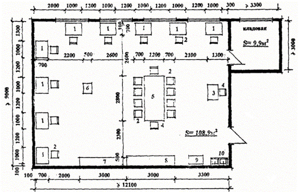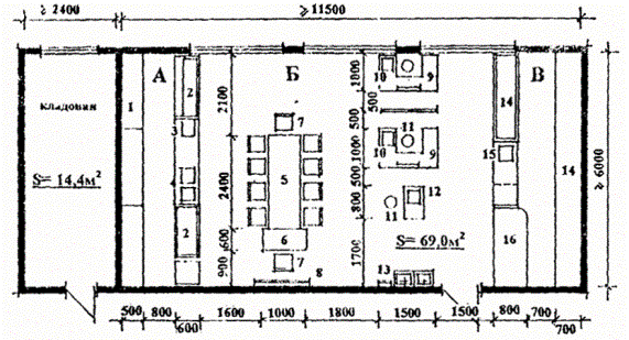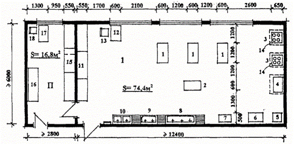 Помещения питания. 5.116. Питание для воспитанников СПУО организуется в одну смену в общей столовой. 5.117. Площадь обеденного зала принимается из расчета 1,1 м2 на 1 посадочное место; при зале предусматривается умывальная из расчета 3 м2 (1 умывальник) на каждые 18 - 20 мест. 5.118. В производственные помещения кухни должен предусматриваться отдельный вход. 5.119. Состав, площади и оборудование производственных помещений кухни в СПУО следует определять заданием на проектирование, исходя из возможностей работы на полуфабрикатах или сырье, учитывая наличие базового предприятия школьных столовых в муниципальном районе. Работа технологического оборудования кухни предусматривается на электричестве. 5.120. Кроме питания воспитанников, помещения кухни должны обеспечивать питание персонала. 5.121. Для питания персонала предусматривается обеденный зал самообслуживания (или буфет) из расчета 1,0 м2 на 1 посадочное место. Его следует располагать в составе помещений столовой (если по архитектурно-планировочному решению группа помещений питания непосредственно примыкает к административной группе помещений) в противном случае - в группе административных помещений. Количество мест определяется заданием на проектирование, исходя из количества питающихся в учреждении, продолжительности обеденного времени и количества смен. При зале предусматривается подсобное помещение, предназначенное для раздачи пищи, хранения и мойки посуды площадью 8 м2. 5.122. Для обслуживания изолятора в СПУО-2 при помещениях кухни следует предусматривать раздаточную с удобным доступом к внутренним коммуникационным связям (коридорам, лестницам). 5.123. Учитывая специфику контингента воспитанников СПУО-2 (большое количество подростков с хроническими заболеваниями в запущенной форме), в состав производственных помещений кухни следует включать кабинет диетсестры. 5.124. Рекомендуемые состав и площади производственных помещений кухни приведены в табл. 5.9. Таблица 5.9. Рекомендуемый состав и площади производственных помещений кухни.