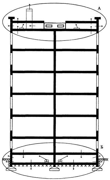 Выбор значений осуществляют согласно приведенной табл. 3.3 МГСН 2.01-99. Промежуточные значения qhreq следует определять путем линейной интерполяции. Примеры. 1. Требуется определить требуемый удельный расход тепловой энергии для многосекционного жилого здания высотой 17 этажей. Согласно табл. 3.3 требуемый qhreq равен 95 кВт · ч/м2. 2. Для жилых зданий высотой в 4 этажа qhreq равен 145 кВт · ч/м2, для зданий 5 этажей - 130, 6 этажей - 125, 7 этажей - 120, 8 этажей 115, 9 этажей 110, 10 этажей - 105, 11 этажей - 100 кВт · ч/м2. п. 3.6.1.д. Определяют требуемые сопротивления теплопередаче ограждающих конструкций (стен, покрытий, чердачных перекрытий, цокольных перекрытий, окон и фонарей, наружных дверей и ворот) согласно пп. 3.3.3 и 3.3.4 исходя из минимальных требований по условиям комфорта и недопустимости образования конденсата, и рассчитывают приведенные сопротивления теплопередаче Ror этих ограждающих конструкций, добиваясь выполнения условия Ror ≥ Roreq. При определений минимально допустимого требуемого сопротивления теплопередаче ограждающих конструкций по формуле (3.2) коэффициент n, устанавливается в зависимости от положения наружной поверхности ограждающей конструкции отапливаемого помещения по отношению к расчетной температуре наружного воздуха, в общем виде определяется по формуле; n = (tint - tintc) / (tint - text) (1.1) где tint - расчетная температура внутреннего воздуха, °С, принимаемая согласно ГОСТ 30494-96; tintc - температура воздуха, °С, в пространстве, расположенном между отапливаемыми помещениями и наружной средой (в чердаке, подвале или другом подобном помещении); text - расчетная температура наружного воздуха, °С, равная средней температуре наиболее холодной пятидневки обеспеченностью 0,92 по СНиП 2.01.01-82. Температура tintc определяется на основе расчета теплового баланса чердака или подвала при расчетных условиях внутренней и наружной среды (рис. 1). При этом сопротивление теплопередаче покрытия теплого чердака, фризовых и цокольных стен назначается из условия невыпадения конденсата на их внутренней поверхности. Сопротивление теплопередаче полов по грунту и стен, расположенных ниже уровня земли, следует определять согласно прил. 9 СНиП 2.04.05-91* (изд. 1998 г.). Методика расчета температуры воздуха на чердаке или в подвале из условий теплового баланса этого помещения приведена в [1]. Приведенное сопротивление теплопередаче Ror, м2 · °С/Вт, неоднородной ограждающей конструкции (или ее участка) определяется согласно раздела 2 настоящего пособия по формуле (2.4) Главным в расчете приведенного сопротивления теплопередаче является определение теплового потока Q, проходящего через ограждающую конструкцию в условиях эксплуатации в течение отопительного периода. Величина Q определяется на основе численного расчета на ЭВМ температурного поля конструкции на основе специальных программ для расчета двухмерных или трехмерных температурных полей. Рис. 1. Схема распределения тепловых потоков в теплом чердаке (А) и подвале (Б) многоэтажного жилого дома для расчета температуры tintc на основе теплового баланса Для этой цели в выбранной ограждающей конструкции (или ее участке) определяют характерные сечения, каждое из которых вычерчивают в определенном масштабе, выделяют участки с различными теплопроводностями, указывают условия теплообмена на границах (температуры воздуха контактирующего с поверхност