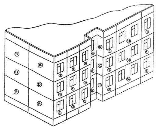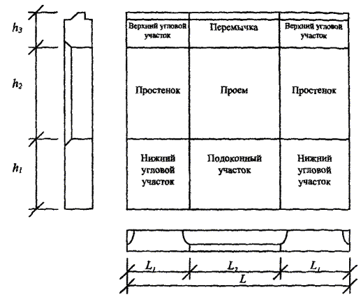 В случае определения приведенного сопротивления теплопередаче по формулам (2.4) и (2.6) участков ограждающей конструкции (например, стеновой панели) ее приведенное сопротивление теплопередаче Ropr определяется по формуле где Ai - площадь i-го участка стеновой панели, м2; Roir - приведенное сопротивление теплопередаче i-го участка стеновой панели, м2 · °С/Вт; m - число участков, на которое разбита стеновая панель. Рис. 2. Принципиальная схема разбивки площадей расчетных участков стеновой панели для определения Ror Рис. 3. Пример расположения различных типов стеновых панелей на здании 1 (1а) - одномодульная (двухмодульная) рядовая панель; 2 - одномодульная панель с рядовыми и наружным угловым стыками; 3 (3а) - одномодульная (двухмодульная) рядовая панель с примыканием к цокольному перекрытию; 4 (4а) - одномодульная (двухмодульная) рядовая панель с примыканием к покрытию; 5 - одномодульная панель с рядовым и наружным угловым стыками и примыканием к цокольному перекрытию; 6 - одномодульная панель с рядовым и наружным угловым стыками и примыканием к покрытию; 7 - одномодульная панель с двумя внутренними угловыми стыками; 8 - одномодульная панель с двумя внутренними угловыми стыками и примыканием к цокольному перекрытию; 9 - одномодульная панель с двумя внутренними угловыми стыками в примыканием к покрытию; 10 - узкая глухая панель с наружным и внутренним угловыми стыками; 11 - узкая глухая панель с наружным и внутренним угловыми стыками и примыканием к цокольному перекрытию; 12 - узкая глухая панель с наружным и внутренним угловыми стыками и примыканием к покрытию; 13 - двухмодульная глухая панель с рядовым и наружным угловым стыками; 14 - двухмодульная глухая панель с рядовым и наружным угловым стыками и примыканием к цокольному перекрытию; 15 - двухмодульная глухая панель с рядовым и наружным угловым стыками и примыканием к покрытию. Примечание. В формулах (1.2), (1.3) и далее по тексту: индекс i означает порядковый номер участка или панели ограждающей конструкции; индекс j - порядковый номер слоя многослойной ограждающей конструкции. Так, например, для стеновой панели с оконным проемом схема разбивки на расчетные участки приведена на рис. 2. Общая площадь панели определяется по осям вертикальных и горизонтальных стыков за вычетом площади проема, размеры которого устанавливаются в свету. В реальном здании могут применяться различные типы стеновых панелей (рис. 3): · рядовые, когда соединение панели примыкает в одной плоскости с расчетной; · угловые, когда одна панель или две соседние по этажу панели примыкают под углом, причем угол может быть как наружный, так и внутренний. Здесь могут встретиться следующие варианты: - панель с рядовым и наружным угловым стыками; - панель с рядовым и внутренним угловыми стыками; - панель с двумя наружными угловыми стыками; - панель с двумя внутренними угловыми стыками; - панель с наружным и внутренним угловым стыками; · карнизные, когда панель примыкает к покрытию или чердачному перекрытию; · панели первого этажа, когда они примыкают к цокольному (над подвалом) перекрытию. Кроме того панели первого и последнего этажа могут иметь все варианты угловых стыков. Помимо панелей с проемами в здании могут быть применены глухие панели. Все эти типы панелей различаются по приведенному сопротивлению теплопередаче. Поэтому варьируя конфигурацие