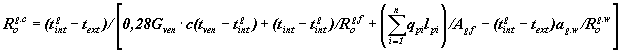 Для утепленных полов на грунте в случае, когда материалы пола и стены имеют расчетные коэффициенты теплопроводности λ < 1,2 Вт/(м · °С), приведенное сопротивление теплопередаче Ros определяют согласно прил. 9 СНиП 2.04.05-91*. 2.3.4. Требуемое сопротивление теплопередаче цокольного перекрытия над «теплым» подвалом Rob.c, м2 · °С/Вт, определяют по формуле Rob.c = n · Roreq (2.28) где Roreq - требуемое сопротивление теплопередаче перекрытий над подвалами, определяемое по табл. 1б СНиП II-3-79* (изд. 1998 г.) в зависимости от градусосуток отопительного периода климатического района строительства; n - коэффициент, определяемый по формуле n = (tint - tintb) / (tint - text) (2.29) tint, text - то же, что в формуле (3.2) МГСН 2.01-99; tintb - то же, что в п. 2.3.3. 2.3.5. Определяют температуру воздуха в подвале tintb, °С, по формуле где tint - расчетная температура воздуха в помещении над подвалом, °С; text, qpi, lpi, c - то же, что в формуле (2.22); Ab - площадь подвала (цокольного перекрытия), м2; Rob.c - требуемое сопротивление теплопередаче цокольного перекрытия, м2 · °С/Вт, устанавливаемое согласно п. 2.3.4; Vb - объем воздуха, заполняющего пространство подвала, м3; n - кратность воздухообмена в подвале, 1/ч: при прокладке в подвале газовых труб I = 1 1/ч, в остальных случаях I = 0;5 1/ч; γ - плотность воздуха в подвале, принимаемая равной γ = 1,2 кг/м3; As - площадь пола и стен подвала, контактирующих с грунтом, м2; Ros - то же, что в п. 2.3.2; Ab.w - площадь наружных стен подвала над уровнем земли, м2; Rob.w - то же, что в п. 2.3.3. Если tintb отличается от первоначально заданной температуры, расчет повторяют по пп. 2.3.3 - 2.3.5 до получения равенства величин в предыдущем и последующем вариантах расчета. 2.3.6. Проверяют по формуле (1) СНиП II-3-79* (изд. 1998 г.) полученное расчетом требуемое сопротивление теплопередаче цокольного перекрытия на удовлетворение требования по нормативному температурному перепаду для пола первого этажа, равному Δtn = 2 °С (таблица 2* СНиП II-3-79* (изд. 1998 г.)). Пример расчета «теплого» подвала приведен в приложении В. п. 3.3.4. Требуемое сопротивление теплопередаче Roreq светопрозрачных конструкций и наружных дверей следует принимать: 0,54 м2 · °С/Вт для окон, балконных дверей и витражей; 0,81 м2 · °С/Вт для глухой части балконных дверей. 2.4. Светопрозрачные ограждающие конструкцииСветопрозрачные ограждающие конструкции различных типов зданий следует подбирать по следующей методике: 2.4.1. Требуемое сопротивление теплопередаче Roreq светопрозрачных конструкций следует определять по таблице 1б* СНиП II-3-79* (изд. 1998 г.). При этом сначала определяют количество градусосуток отопительного периода Dd по табл. 3.2 МГСН 2.01-99. В зависимости от величины Dd и типа проектируемого здания по колонкам 6 и 7 вышеупомянутой таблицы определяется значение Roreq. Для промежуточных значений Dd величина Roreq определяется интерполяцией. 2.4.2. Выбор светопрозрачной конструкции осуществляется по значению приведенного сопротивления теплопередаче Ror, полученному в результате сертификационных испытаний. Если приведенное сопротивление теплопередаче выбранной светопрозрачной конструкции Ror, больше или равно Roreq, то эта конструкция удовлетворяет требованиям норм. 2.4.3. При отсутствии сертифицированных данных допускается использовать при проектировании значения Ror, приведенные в приложении 6* СНиП II-3-79* (изд. 1998 г.). Значения Ror в этом приложении даны для случаев, когда отношение площади остекления к площади заполнения 