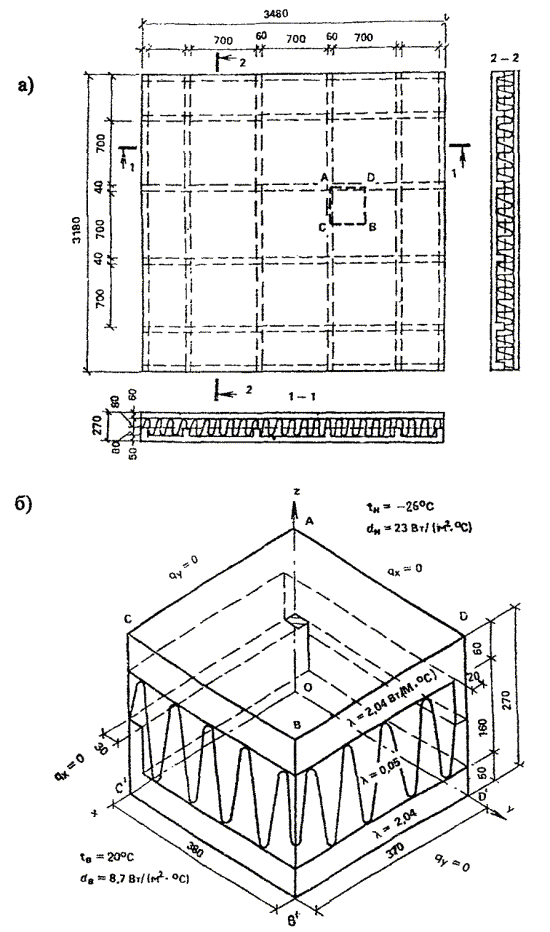 Список литературы1. Фокин К.Ф. Строительная теплотехника ограждающих частей зданий. Стройиздат, М., 1973, стр. 52 - 53. 2. Расчет и проектирование ограждающих конструкций зданий. Справочное пособие к СНиП. Стройиздат, М., 1990, стр. 196 - 220. ПРИЛОЖЕНИЯПриложение АМетодика определения приведенного сопротивления теплопередаче ограждающих конструкций на основе расчета температурных полейА.1. Ограждающую конструкцию разбивают на расчетные (двухмерные или трехмерные в отношения распределения температур) участки. А.2. При определении сопротивления теплопередаче Ro, м2 · °С/Вт, по данным расчета на персональном компьютере (ПК) стационарного двухмерного температурного поля различают два случая: а) Исследуемая область, выделенная для расчета температурного поля, представляет собой фрагмент ограждающей конструкции, для которого надлежит определить величину Ro. б) Исследуемая область, для которой рассчитывается температурное поле, меньше по размеру, чем анализируемый фрагмент ограждающей конструкции. В первом случае искомая величина Ro вычисляется по формуле: Ro = (tint - text) L / ΣQ (А.1) где ΣQ - сумма тепловых потоков, пересекающих исследуемую область, Вт/м2, определенная в результате расчета температурного поля; tint и text - соответственно температура внутреннего и наружного воздуха, °С; L - протяженность, м, исследуемой области. Во втором случае Ro определяют по формуле: Ro = (tint - text) L / [ΣQ + (tint - text) Lcon / Rocon] (А.2) где Lcon - протяженность, м, однородной части фрагмента ограждающей конструкции, отсеченной от исследуемой области в ходе подготовки данных к расчету температурного поля; Rocon - сопротивление теплопередаче однородной ограждающей конструкции, м2 °С. А.3. При расчете двухмерного температурного поля выбранный участок вычерчивают в определенном масштабе и на основании чертежа составляют схему расчета, упрощая ее для удобства разбиения на участки и блоки. При этом: а) заменяют сложные конфигурации участков, например криволинейные, более простыми, если эта конфигурация имеет незначительное влияние в теплотехническом отношении; б) наносят на чертеж границы области исследования и оси координат (x, y или r, z). Выделяют участки с различными теплопроводностями и указывают условия теплообмена на границах. Проставляют все необходимые размеры; в) расчленяют область исследования на элементарные блоки, выделяя отдельно участки с различными коэффициентами теплопроводности. Вычерчивают в масштабе схему расчленения исследуемой области и проставляют размеры всех блоков; г) вычерчивают область исследования в условной системе координат x′, y′, когда все блоки принимаются одного и того же размера. Проставляют координаты вершин полигонов, ограничивающих участки области с различными теплопроводностями, и координаты вершин многоугольников, образующих границы исследуемой области. Нумеруют участки и границы исследуемой области и подписывают вершины областей теплопроводностей, температур (или тепловых потоков) на границах или окружающего воздуха и коэффициентов теплоотдачи; д) пользуясь двумя чертежами, выполненными по пп. «в» и «г», и руководствуясь стандартной (обычной) последовательностью расположения, составляют комплект численных значений исходных данных для ввода в ПК. Пример расчета 1 Требуется определить приведенное сопротивление теплопередаче трехслойной мет