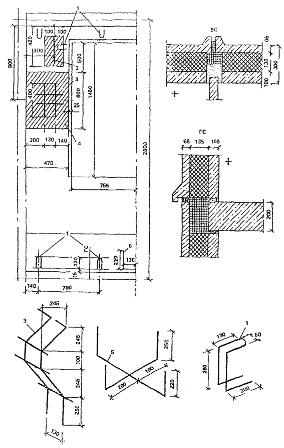 Примечания: 1. В таблице приведены Rkcon, Rcm, Ry - термические сопротивления, м2 · °С/Вт, соответственно панели вне теплопроводного включения, стыка, утолщения внутреннего железобетонного слоя, определяемые по формуле (2.2); δF′ и δw′ - расстояния, м, от продольной оси оконной коробки до ее края и до внутренней поверхности панели. 2. Промежуточные значения следует определять интерполяцией. Пример расчета Определить приведенное сопротивление теплопередаче Ror одномодульной трехслойной железобетонной панели на гибких связях с оконным проемом крупнопанельного жилого дома серии III. А. Исходные данные Панель толщиной 300 мм содержит наружный и внутренний железобетонные слои, которые соединены между собой двумя подвесками (в простенках), подкосом, расположенным в нижней зоне подоконного участка, и распорками: 10 - у горизонтальных стыков и 2 - в зоне оконного откоса (рис. Б.1). Рис. Б.1. Конструкция трехслойной панели на гибких связях 1 - распорки; 2 - петля; 3 - подвески; 4 - бетонные утолщения (δ = 75 мм внутреннего железобетонного слоя); 5 - подкос В табл. Б.4 приведены расчетные параметры панели. В зоне подвесок и петель внутренний бетонный слой имеет утолщения, заменяющие часть слоя утеплителя. Таблица Б.4