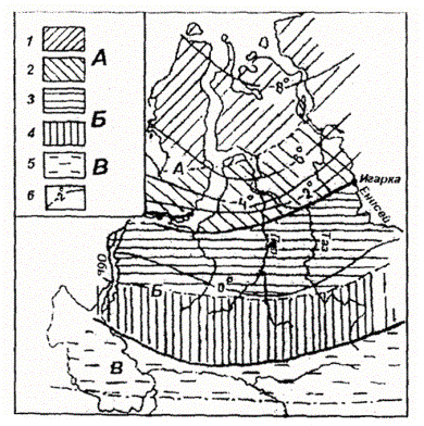 высокого и низкого давления) толщиной ( 2.2. «Геовеб» может эксплуатироваться при температуре от минус 65 до 50 °С при воздействии ультрафиолетового излучения, в условиях контакта с водой, бетоном, почвогрунтами с показателем кислотности рН = 4 ÷ 11. 2.3. «Геовеб» выпускают в виде складывающихся секций прямоугольной формы в плане площадью 15 и 30 м2, массой 15 и 42 кг. «Геовеб» выпускают преимущественно с рельефной текстурированной поверхностью граней ячеек, которая позволяет увеличить трение между стенками ячеек и заполнителем. «Геовеб» выпускают также с перфорированными стенками ячеек, что также позволяет повысить трение с крупнозернистым заполнителем и обеспечить дренаж. При этом коэффициент проницаемости «Геовеба», равный отношению суммарной площади отверстий на одной грани ячейки к площади этой грани, не должен превышать 0,3. 2.4. Георешетки «Геовеб» выпускают с ячейками следующих размеров: - стандартная ячейка: 244×203 мм; крупная ячейка: 488×406 мм; высота стенки ячейки: 50; 76; 102; 152 и 203 мм; - стандартная А-секция: ширина - 2,44 м, длина - от 0,61 до 9,1 м (рис. 2.1, прил. 1); стандартная В-секция: длина - 6,10 м, ширина - от 0,73 до 2,44 м (см. прил. 1). Рис 2.1. Стандартная А-секция «Геовеб» 3. ОСОБЕННОСТИ ИНЖЕНЕРНО-ГЕОКРИОЛОГИЧЕСКИХ УСЛОВИЙ РАЙОНОВ ВЕЧНОЙ МЕРЗЛОТЫ ЗАПАДНОЙ СИБИРИ, УЧИТЫВАЕМЫЕ ПРИ ИСПОЛЬЗОВАНИИ «ГЕОВЕБА»3.1. В зоне распространения вечной мерзлоты в Западной Сибири применительно к дорожному строительству (в частности, при использовании «Геовеба») следует выделить три геокриологические области - северную, центральную и южную (рис. 3.1). 3.2. В северной области А многолетнемерзлые породы имеют повсеместное распространение как по площади, так и по вертикали и достигают мощности более 500 м. Талики приурочены в основном к крупным рекам - Оби, Пуру, Тазу, Надыму и др., а также к глубоким озерам. Температура мерзлых пород в северной области на уровне нулевых годовых амплитуд изменяется от минус 9 °С на севере до минус 3 °С на юге. В ее северном районе 1 распространены в основном мерзлые толщи, которые характеризуются высокой льдистостью (до 60 - 70 %). Криогенная текстура отложений слоистая, линзовидная, толстошлировая. В районе 2 преимущественно распространены мерзлые эпигенетические толщи. Мощность сезонно-талого слоя в северной зоне изменяется от 0,3 м в торфяниках до 1,5 м в песках. Ведущими криогенными физико-геологическими процессами в северной области А являются криогенное растрескивание грунтов, термокарст, склоновые процессы. Рис. 3.1. Схема мерзлотных областей (А, Б и В) и районов (1 - 5) верхней (10 - 20 м) толщи пород криолитозоны Западной Сибири: А - северная область (сплошная вечная мерзлота); Б - центральная область (прерывистая и островная вечная мерзлота); В - южная область (зона перелетков); 1 - пылеватые песчано-глинистые, часто засоленные мерзлые породы, часто с пластовыми и клиновидными льдами и криопегами; 2 - пылеватые песчано-глинистые засоленные мерзлые породы, часто с клиновидными льдами и криопегами; 3 - торф и песчано-глинистые мерзлые породы, иногда с клиновидными льдами; 4 - мерзлые торфяники и немерзлые минеральные грунты; 5 - мерзлые породы с глубоко залегающей (> 20 м) кровлей; 6 - изолинии температур на границе нулевых годовых амплитуд 3.3. Центральная область Б характеризуется прерывистым и островным распространением вечной мерзлоты. В ее северном районе 3 ве