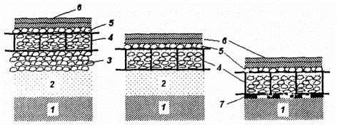 4. ВАРИАНТЫ СХЕМ КОНСТРУКТИВНЫХ РЕШЕНИЙ С ИСПОЛЬЗОВАНИЕМ ОБЪЕМНОЙ ГЕОРЕШЕТКИ «ГЕОВЕБ»4.1. «Геовеб» в конструкциях дорожных одежд4.1.1. «Геовеб» в конструкциях дорожных одежд может применяться в целях: - сокращения объемов дискретных материалов; - повышения прочности одежды при том же расходе дискретных материалов; - замены технологии устройства щебеночных слоев, предусматривающей расклинцовку; - замены технологии укрепления вяжущими в тех случаях, когда традиционная технология неприменима (зимние работы и т.п.); - повышения несущей способности дискретных слоев; - обеспечения проезда по песчаному слою построечного транспорта при устройстве песчаного основания под цементобетонные покрытия; - замены покрытий из железобетонных плит на нежесткую временную конструкцию, обеспечивающую движение транспортных средств на первой стадии строительства дороги в северных условиях и на заболоченных территориях; - создания цементобетонного основания с блочной структурой, обеспечивающего повышение температурной трещиностойкости устраиваемого на нем асфальтобетонного покрытия. 4.1.2. Конструктивные слои дорожных одежд, устраиваемые на основе георешетки «Геовеб», могут играть роль: - слоя покрытия; - несущего слоя основания; - дополнительного (дренирующего или теплоизолирующего) слоя основания; - комбинированного (несущего и дренирующего) слоя основания. 4.1.3. В зависимости от функции, отводимой конструктивному слою на основе «Геовеба», должны определяться требования к заполнителю ячеек, а также к самой георешетке в отношении геометрических параметров и наличия перфорации. Во всех конструктивных слоях дорожных одежд при использовании дискретного заполнителя следует применять перфорированный «Геовеб». В основании жестких и нежестких дорожных одежд следует использовать «Геовеб» с размером ячейки 244×203 мм. Высота стенки георешетки «Геовеб», применяемой в нежестких дорожных одеждах, должна выбираться исходя из расчета на прочность конструкции дорожной одежды, но не менее 152 мм. В основании сборного покрытия следует применять «Геовеб» с высотой стенки 76 мм. В случае применения не укрепленного вяжущим (или укрепленного малыми добавками) дискретного заполнителя ячеек роль «Геовеба» сводится к механическому укреплению слоя из этого дискретного заполнителя (щебня, песка и т.п.). При заполнении ячеек «Геовеба» бетоном роль георешетки сводится к обеспечению создания блочной структуры бетонного слоя, способствующей в случае применения ее в основании асфальтобетонного покрытия повышению температурной трещиностойкости конструкции. 4.1.4. При использовании «Геовеба» в конструкции переходного типа (рис. 4.1) конструктивный слой на его основе может играть роль покрытия. При этом в зависимости от предполагаемого характера движения и требуемого срока службы дороги может быть предусмотрено заполнение ячеек: - песком; - щебнем; - местным дискретным материалом (например, шлаком и т.п.); - дискретным материалом, укрепленным неорганическим вяжущим (сухой смесью с последующим увлажнением). При этом в качестве дискретного заполнителя используется тот же материал, который предусмотрен в основании. 4.1.5. Конструкции переходного типа с дискретным заполнителем ячеек целесообразно применять: - при небольшом движении и ограниченном сроке службы (временные д