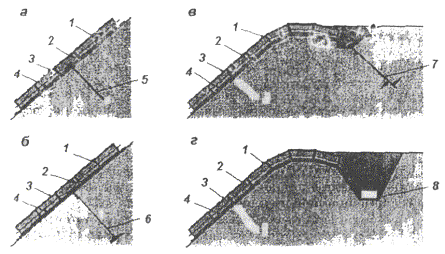 4.3.6. Применение «Геовеба» с заполнением ячеек бетоном позволяет получить долговечную, устойчивую к эрозии конструкцию укрепления откоса равномерной толщины, которая сохраняет способность работать на растяжение и воспринимать деформации грунта тела насыпи. Бетон в качестве заполнителя «Геовеба» рекомендуют для откосов, которые подвергаются длительному воздействию поверхностных вод, ударам волн. В соответствии с проектными требованиями могут варьироваться марка бетона, способы обработки поверхности, а также высота стенок «Геовеба». Способы обработки поверхности (гладилка, щетка или скобок) назначают в зависимости от эстетических требований или требований к ее шероховатости. Для получения определенной текстуры или окраски поверхности в свежеуложенную бетонную смесь может быть заглублен щебень или гравий. Тощие бетонные смеси и смеси с прерывистым гранулометрическим составом используют в качестве заполнителя в тех случаях, когда воздействие поверхностных вод является умеренным. 4.3.7. Выбор геотекстильного материала для подстилающего слоя зависит от грунтово-гидрологических условий и характера воздействия ливневых и талых вод на конструкцию укрепления откоса. «Геовеб» со стандартной ячейкой обычно рекомендуют для откосов круче 20° (1:1,25), если бетонная смесь для заполнения не обладает очень низкой осадкой конуса. Высоту стенки ячейки «Геовеба» выбирают с учетом анализа сдвигающих и удерживающих сил, воздействию которых подвергается конструкция. 4.4. Применение «Геовеба» для укрепления поверхности склонов и придорожной полосы4.4.1. Укрепление «Геовебом» поверхности склонов и придорожной полосы может выполняться в целях защиты склонов от оплывания сезоннооттаивающего слоя и термоэрозии, а придорожной полосы - от продольной вдольтрассовой термоэрозии. Заполнение георешеток, обеспечение дренажа и защита от размыва грунта склона и (или) придорожной полосы осуществляются аналогично рекомендациям п. 4.4. 4.4.2. При защите склонов от оплывания сезонно-талого грунта в особо ответственных случаях может применяться комбинирование «Геовеба» с теплоизолирующими слоями (например, торфяными), толщина которых назначается исходя из условия сохранения верхней границы вечной мерзлоты на прежнем уровне или даже ее поднятия (рис. 4.6). 4.4.3. Крепление георешетки на склоне выполняется с помощью какой-либо из анкерных систем. Наиболее часто применяемые системы показаны на рис. 4.7. Глубина заделки анкеров и расстояние между ними должны определяться расчетом с учетом нагрузок от собственного веса, всех видов пригрузок (например, веса снега) и возможности морозного мучения. Рис. 4.6. Вариант закрепления склона и придорожной полосы композитом: 1 - «Геовеб»; 2 - геотекстиль; 3 - теплоизолирующий слой (например, торф) Рис. 4.7. Схема анкерных креплений «Геовеба»: а - поверхностная анкеровка стержнями с АТР-клипом; 6 - то же, стержнями с заглубленным шарниром; в - анкеровка на верху откоса (склона) шнековыми анкерами; г - то же, анкерными столбами (грузами); 1 - стенка «Геовеба»; 2 - трос; 3 - заполнитель; 4 - геотекстиль; 5 - анкерный стержень с АТР-клипом; 6 - анкерный стержень с заглубленным шарниром; 7 - шнековый анкер; 8 - анкерный столб (груз) 4.4.4. При проведении работ по укреплению откосов насыпей, поверхностей склонов, кюветов и канав с помощью объемных геореше